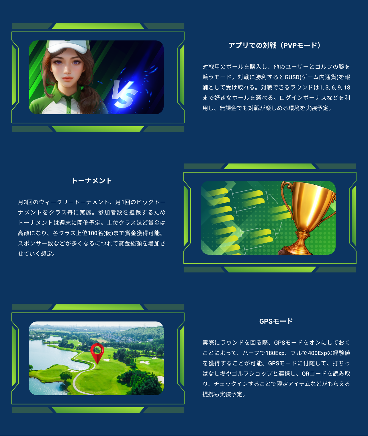 ゴルフユーザーがゲーム内にゴルフクラブやアバターを所有し、現実世界のゴルフでラウンドすることでゲーム内アバターの経験値獲得やアイテムを強化が行えます。