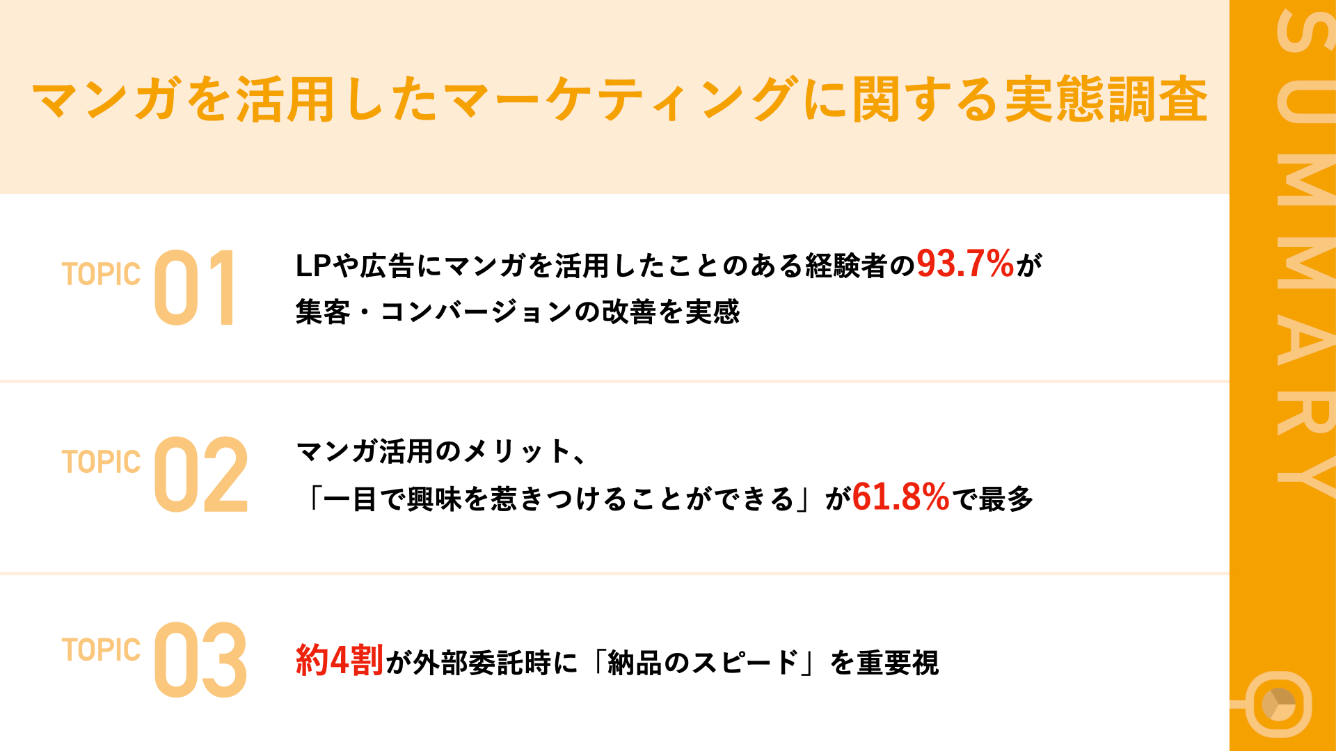 今回の調査では、マーケティングにマンガ広告を活用した企業の多くが、集客・コンバージョンの改善だけでなく、「一目で興味を惹きつけることができる」などの効果を実感していることが明らかになりました。マンガをマーケティングに取り入れる際は、外注をしている企業がほとんどで、制作者の実績やスキル、スケジュールや納品スピードなどをしっかりと見極める必要があることが伝わってくる内容となりました。今後さらに効率的なマーケティング活動を展開するために、スピーディーな納品が可能なマンガ広告を取り入れてみてはいかがでしょうか。