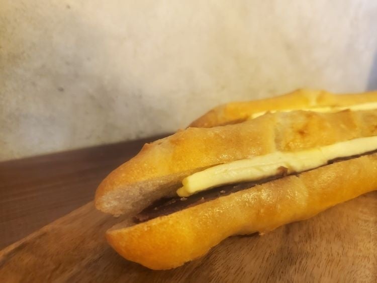 当店オリジナルの『こしあんバター』は、サクサクでもっちりっとしたフランスパンに北海道産のこしあんとバターを挟み込みました。