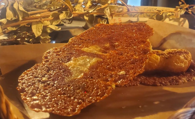 ジューシーなソーセージをデニッシュ生地で包み込み、その周りにパリッと羽根付きチーズをまとわせました。裏面に軽く粒マスタードソースでアクセント。