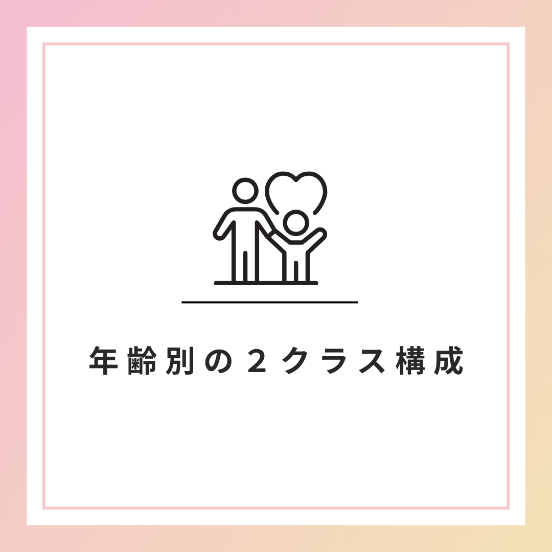 月齢ごとに身体も心も発達の差が大きい幼少期。2クラス構成に分けることで、子ども達に、できないストレスも、できることばかりの退屈さも与えません。ちょっとぶつかったら大けがにつながる。そんな危険性にも配慮しています。