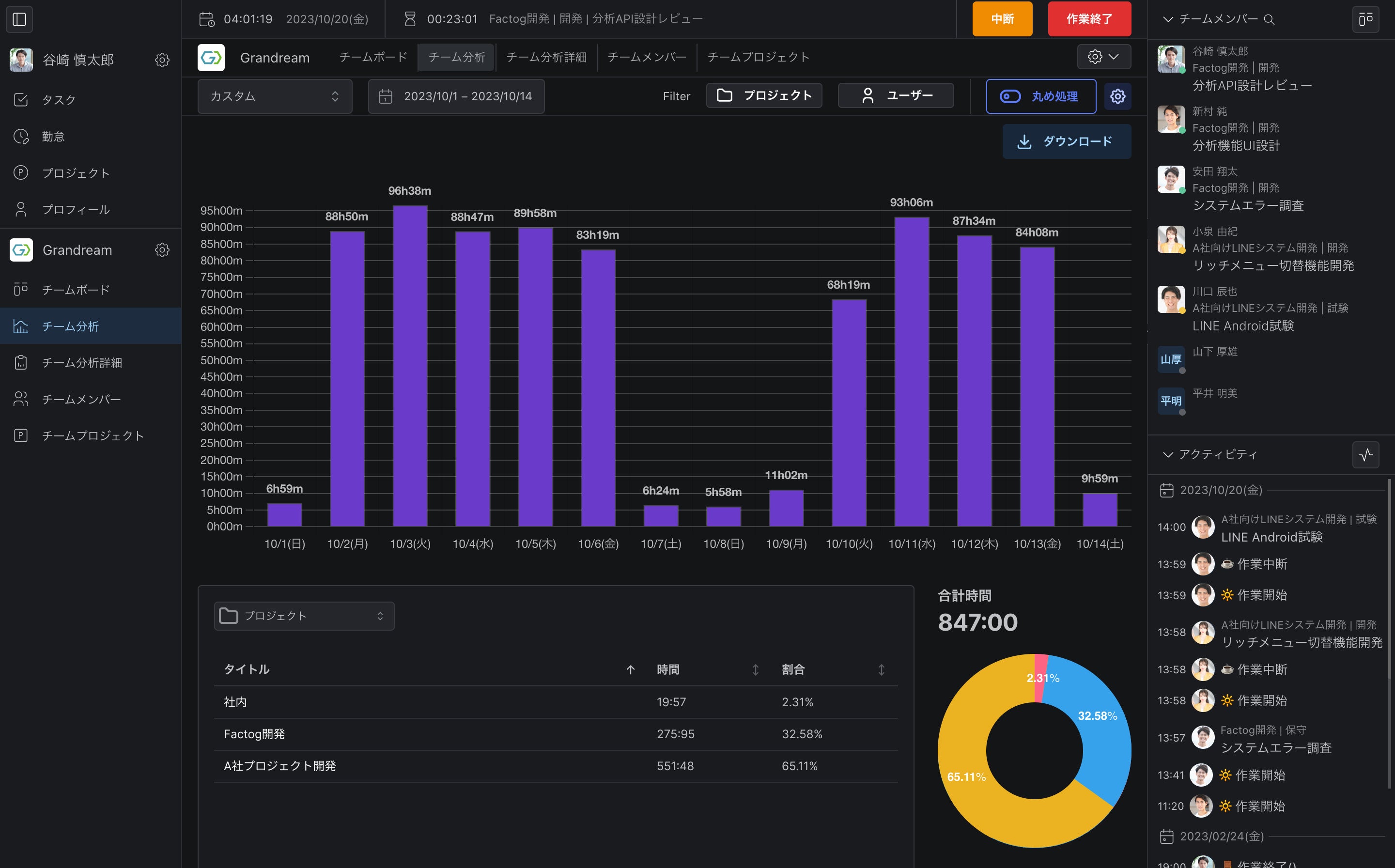 アクティビティ機能でチーム全体の勤怠状況がわかる