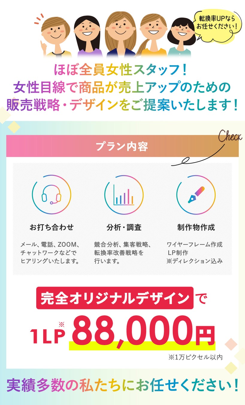 当社オリジナルの制作フォームをご提供。提供いただいた情報やヒアリングした情報をもとに、一からオリジナルデザインを行います。この独自性の高いデザインを、業界でも競争力のある1LPあたり88,000円(税込)という価格で提供しており、高いコストパフォーマンスを実現しています。これにより、限られた予算でも質の高いデザインを求める店舗運営者様に最適です。