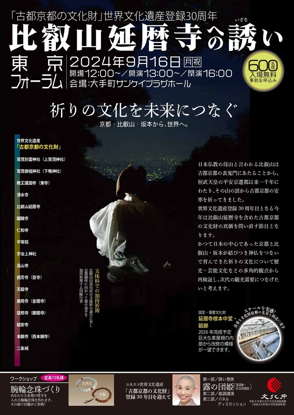 祈りの文化を未来につなぐ。京都・比叡山・坂本から、世界へ。「古都京都の文化財」世界文化遺産登録30周年。