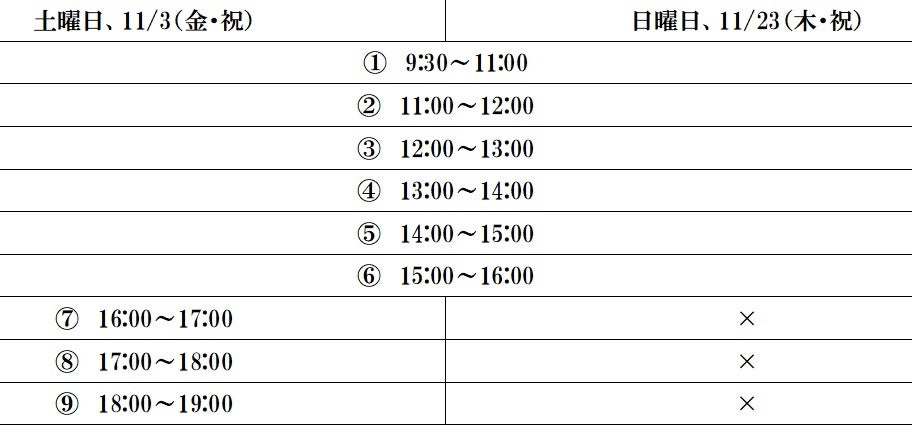 土・日・祝日は事前予約制(日時指定)です。混雑緩和のため、1日を以下の入場時間枠に区切り、その時間枠内にご入場いただきます。入替制ではありません。