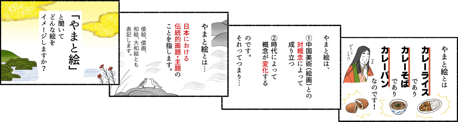 時代によって変化する「やまと絵」。ひと言では説明できない「やまと絵」を、ショートマンガで分かりやすくご紹介する企画です。今後、本展公式サイトにて、主に展覧会の章構成ごとに9月中旬より公開します。
