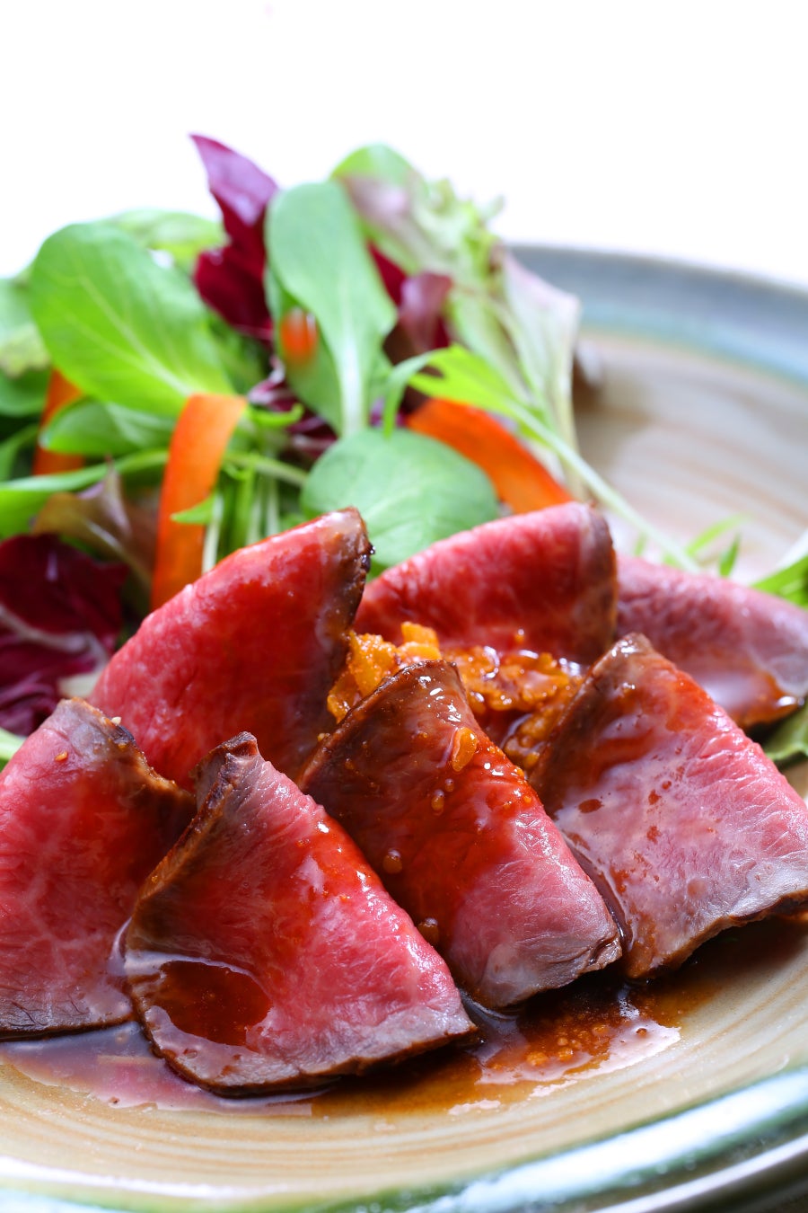 オーブンで焼くのではなく、蒸してじっくり味をなじませる、日本独特の調理法で作るローストビーフ。表面は香ばしく焼け、中はきれいなロゼ。心地よい歯ごたえと後味の良さを堪能できます。