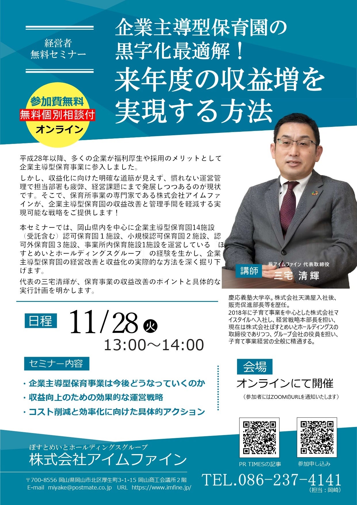 本セミナーでは、岡山県内を中心に企業主導型保育園14施設(受託含む)認可保育園1施設、小規模認可保育園2施設、認可外保育園3施設、事業所内保育施設1施設を運営している『ぽすとめいとホールディングスグループ』の経験を生かし、企業主導型保育園の経営改善と収益化の実際的な方法を深く掘り下げます。