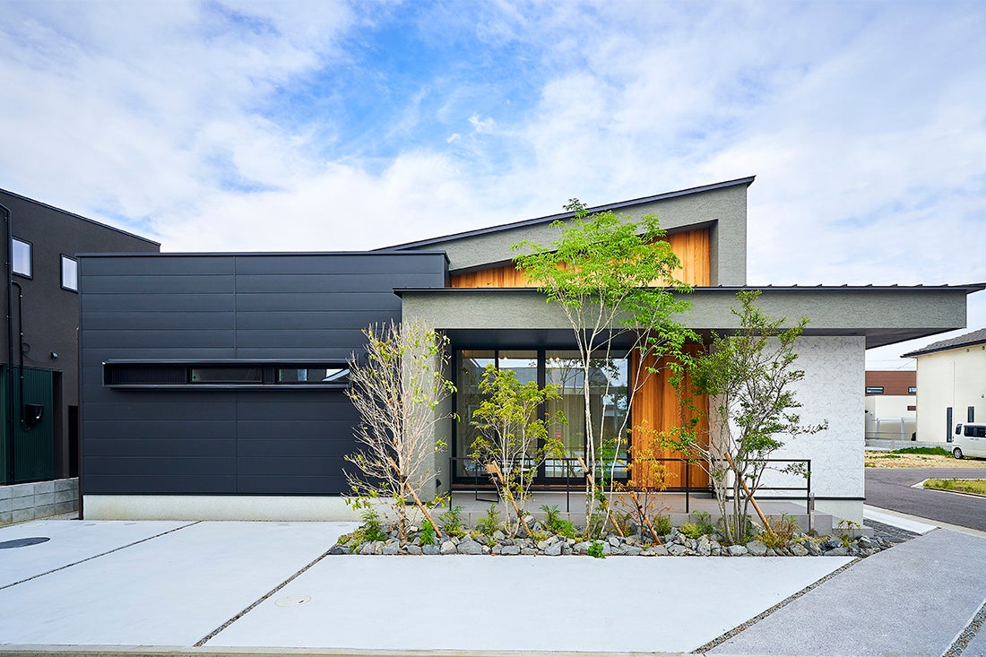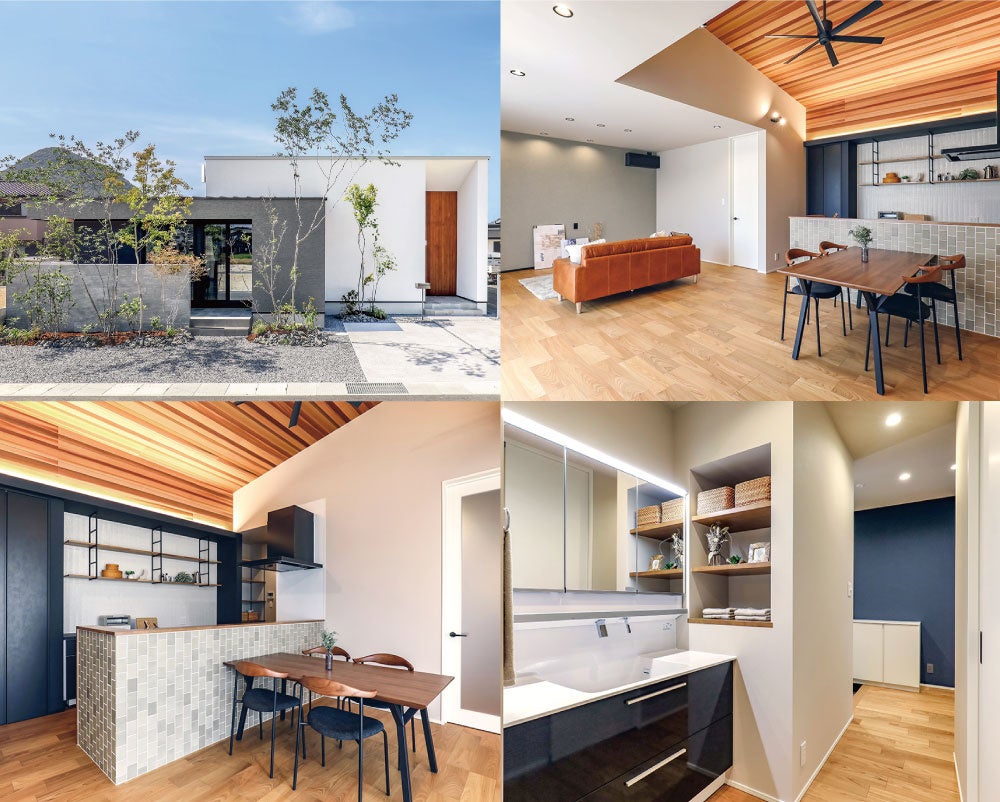 クールな外観に温かみのある塗り壁や木材を織り交ぜたデザインや、リビングと繋がるオープンカフェ風のテラスが特徴のモデルハウス。また、LDKには立体感ある壁やアッシュの板張りの勾配天井など、細部にまでこだわったデザインが施されています。