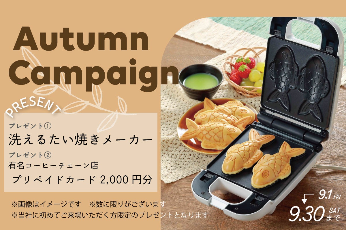 2023年9月30日(土)までにご来場いただいた方限定で「洗えるたい焼きメーカー&有名コーヒーチェーン店プリペイドカード2,000円分」をプレゼント!