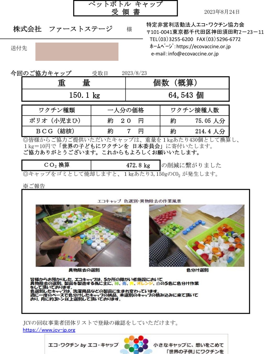 エコキャップは、重量1kgあたり430個として換算。1kg=10円で「世界の子どもにワクチンを 日本委員会」に寄付いたします。集まった64,543個は、ワクチン289人分に相当。CO2換算で472.8kgの削減にもつながりました。