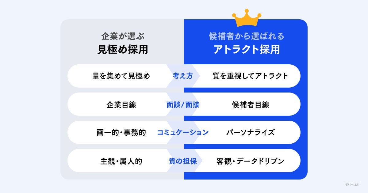 巡り合いの量や質という外的な要素は前提となり、いかに採用体験を磨き上げるか、その進化の為に必要で、かつ今はまだ無いフィードバックデータを生成し獲得することで、初めて内的な要素へ働きかけることが可能になり、採用の可能性が飛躍的に向上し、結果として組織そのものが強くなっていく。組織を強くすることに興味のない経営者はいないはずです。