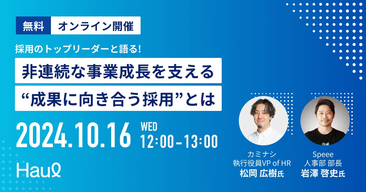 正式ローンチを記念し、2024年10月16日(水)12:00〜13:00 に、RekMA導入企業であるSpeee 人事部 部長の岩澤哲史氏、カミナシ 執行役員 VPofHRの松岡広樹氏と「成果に向き合う採用」についてのセミナーを開催します。