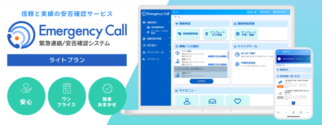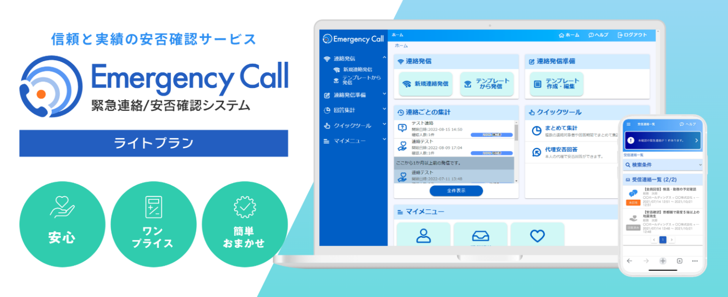 阪神淡路大震災をきっかけに28年間提供してきた緊急連絡/安否確認システム「エマージェンシーコール」を、従業員数300人までの中堅・中小の事業者でも導入しやすくするために、地震などの発生時に安否や出社可否などについて従業員に回答を求める「安否確認」の機能に特化したプランです。初期費用0円、月額1万円(税別)という導入しやすい価格帯での提供となっております。