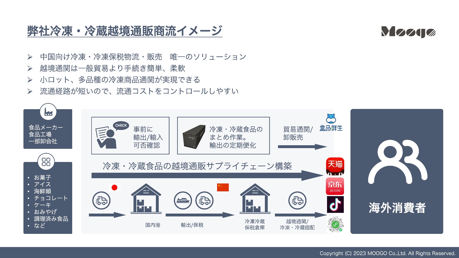 お客様は日本の冷凍冷蔵倉庫に納品していただくだけ。モグで税関等の諸手続きを行い、輸出後は中国保税区の冷凍冷蔵倉庫に保管。EC越境自社チャネルなど多彩な販売経路で販売し、温度管理された倉庫から中国消費者にお届けするコールドチェーンサービス(※)を行ないます。