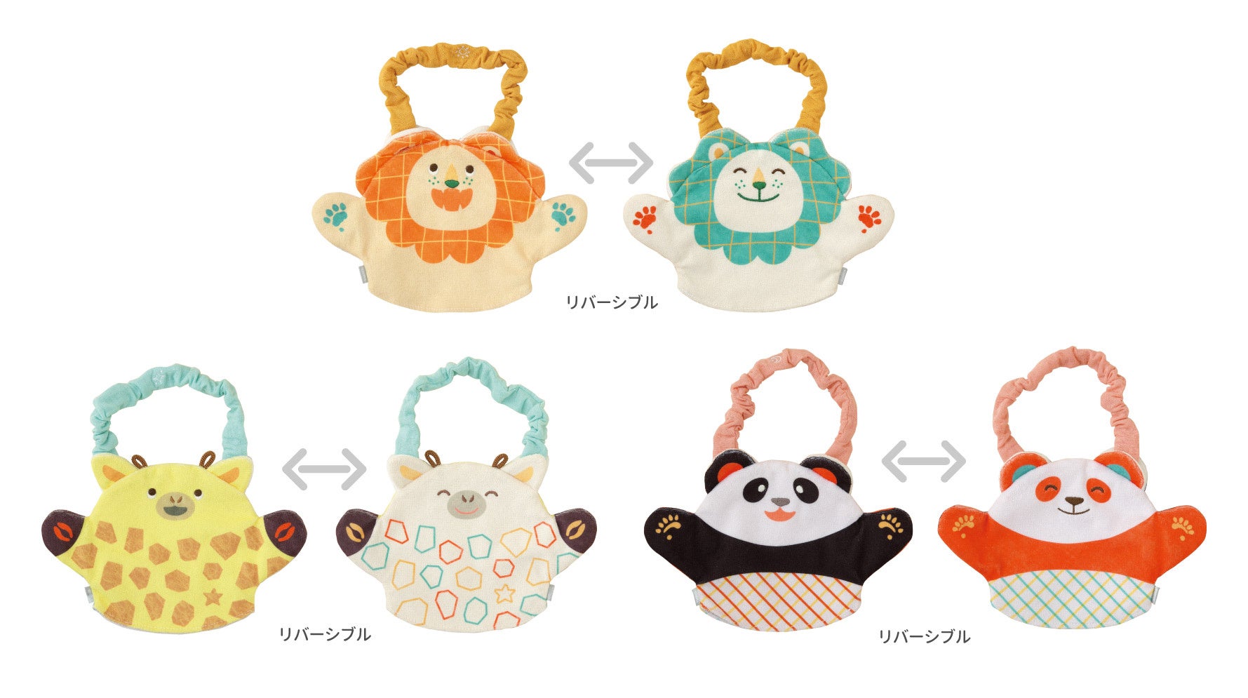 ナチュラルなカラーリングを基調とした従来の4種とは対照的にポップなデザインに仕上げました。表と裏で動物の表情が違うのでその日の服に合わせて好きなデザインを選んだり、リバーシブルを活かした「いないいないばぁ遊び」で赤ちゃんの笑顔を引き出します。