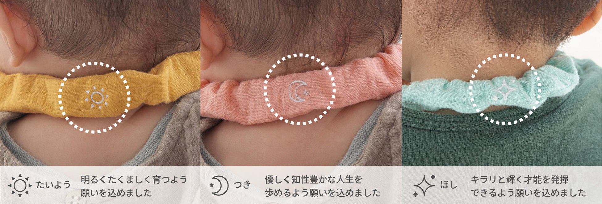 古くから産着を縫う際に、親が子どもを守る祈りをこめて縫った印を「背守り」と言います。紐にはそれぞれに願いを込めたオリジナルの刺繍を施しています。