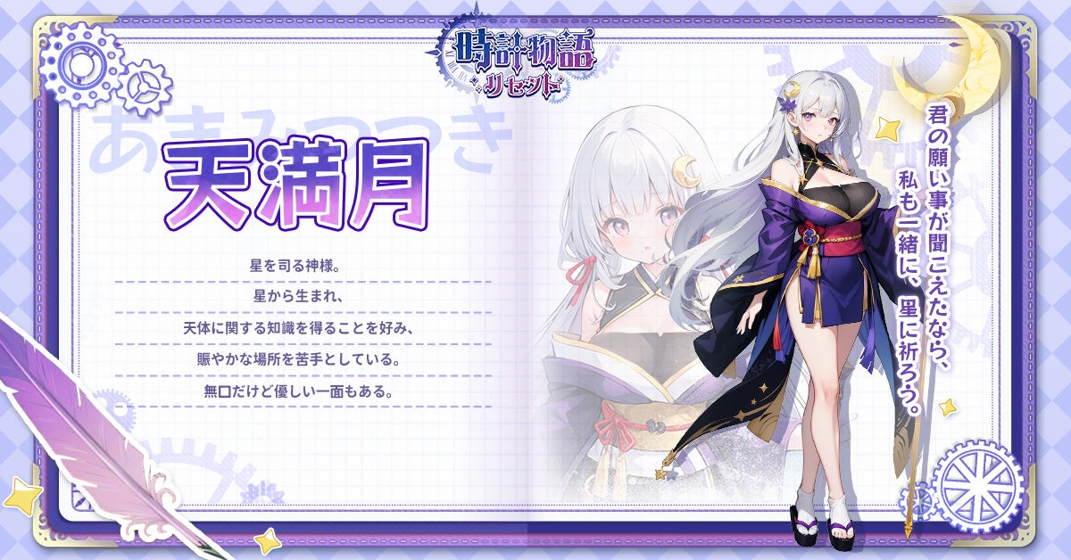 ・「天満月(あまみつつき)」-星を司る神様。星から生まれ、天体に関する知識を得ることを好み、賑やかな場所を苦手としている。無口だけど優しい一面もある。