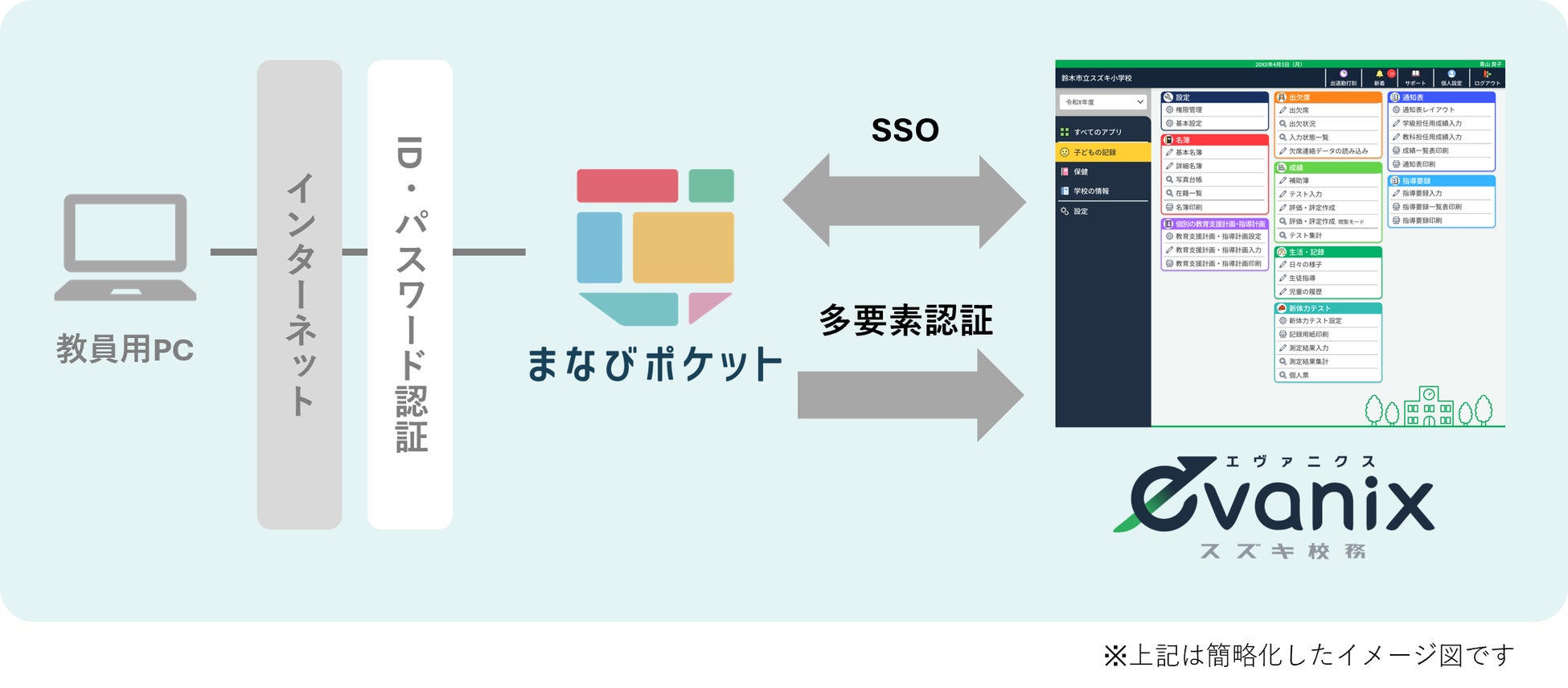 スズキ教育ソフト株式会社は、統合型校務支援システム「evanix」において、NTTコミュニケーションズ株式会社が提供するクラウド型教育プラットフォーム「まなびポケット」とのシングルサインオン(以下 SSO)に対応いたします。これにより、「まなびポケット」に登録したアカウント情報による「evanix」へのシームレスなログインが実現するとともに、「まなびポケット」の統合認証サービスをあわせて利用することでセキュリティレベルの向上も期待できます(※1)。