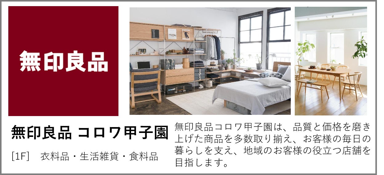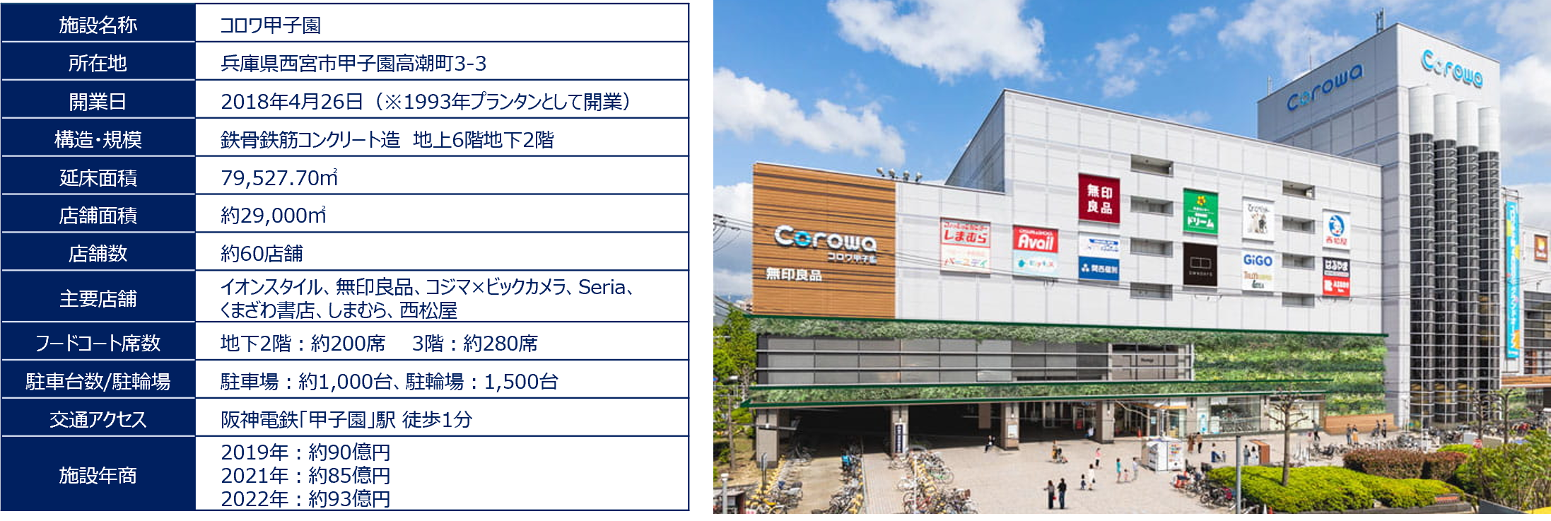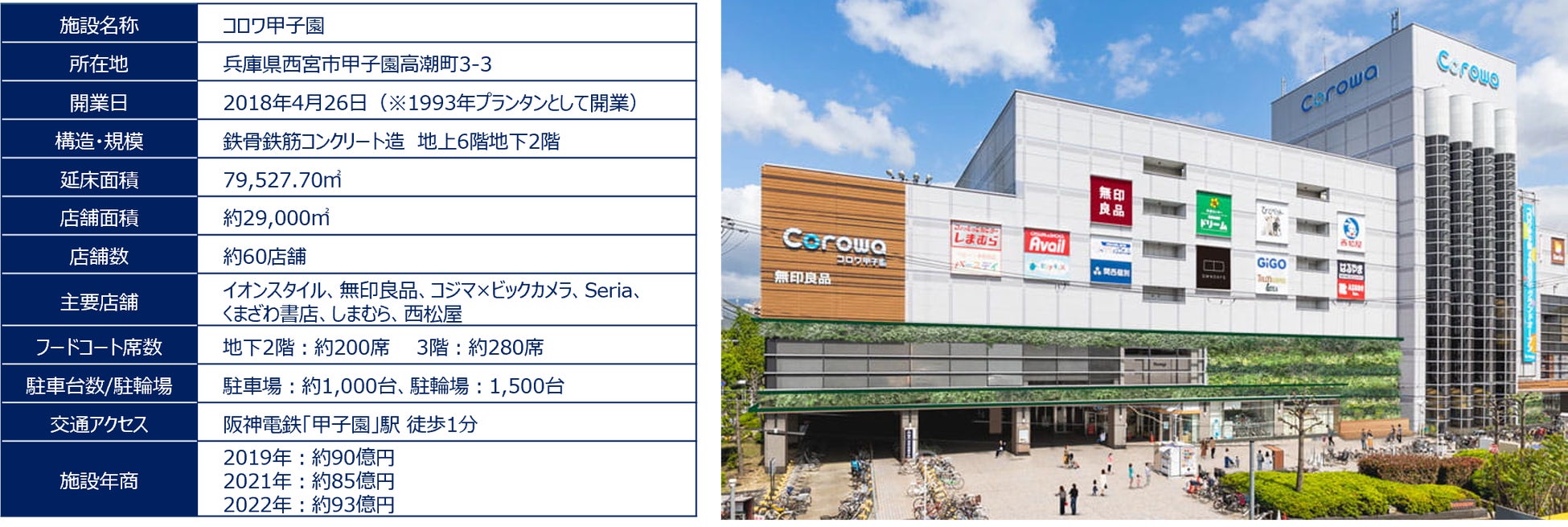 当施設は1993年にプランタンとして開業し、ダイエー、イオンを経て、2018年よりコロワ甲子園として、長きにわたり地元密着型の施設として、甲子園を中心に近隣の多くのお客様にご利用いただいております。