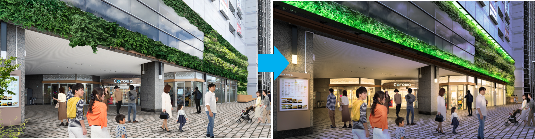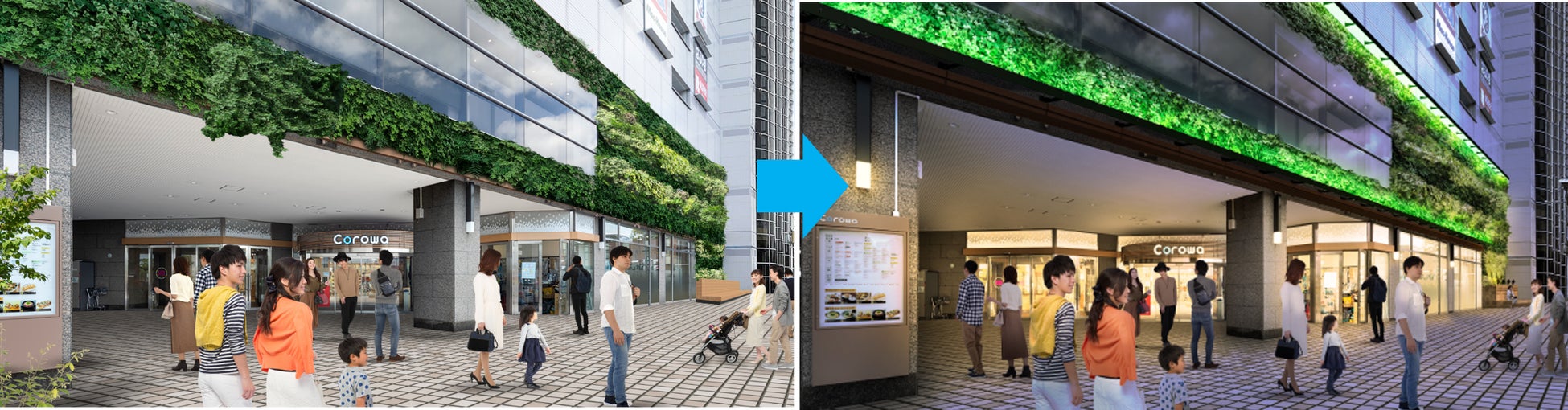 表面温度を下げる効果のある壁面緑化で、環境に配慮したデザインにリニューアル。 緑にあふれた居心地の良い空間を、夜はライトアップで魅力的に演出!