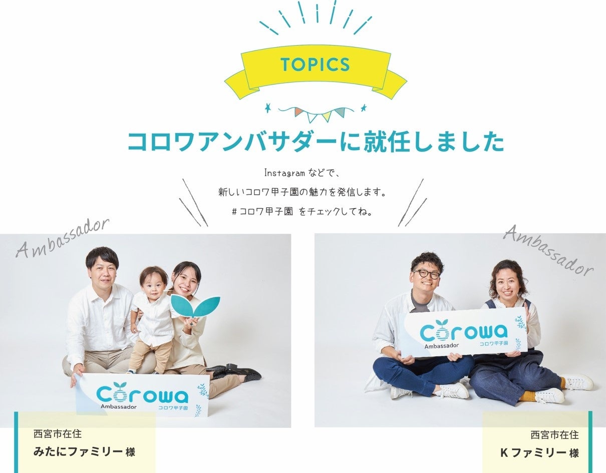 この度、コロワ甲子園のリニューアルをきっかけに、当施設を発信源に、地域の皆様とより一層の連携を図り、 エリア活性に貢献して参りたいと考えております。 その取り組みの一環で、施設情報と共に、地域の魅力的な情報を交えて発信していただける、 ファミリー&フレンズを「コロワ アンバサダー」として募集し、就任いただきました。これからも、コロワ甲子園の魅力を一緒に発信していきます。