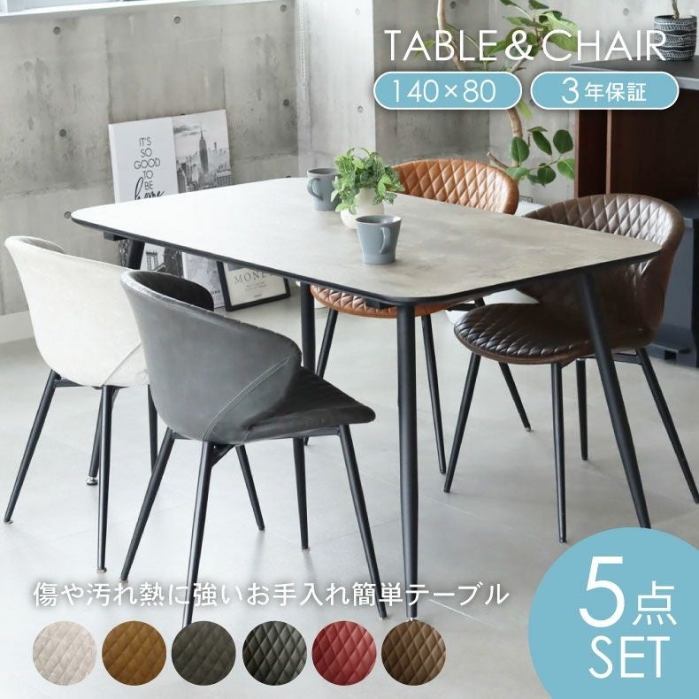 石目調の天板が印象的なテーブルと、味わい深いPUレザーにブラックスチールを組み合わせた椅子のセット。モダンスタイルはもちろん、モノトーンスタイルなど、様々なシーンにフィットします。