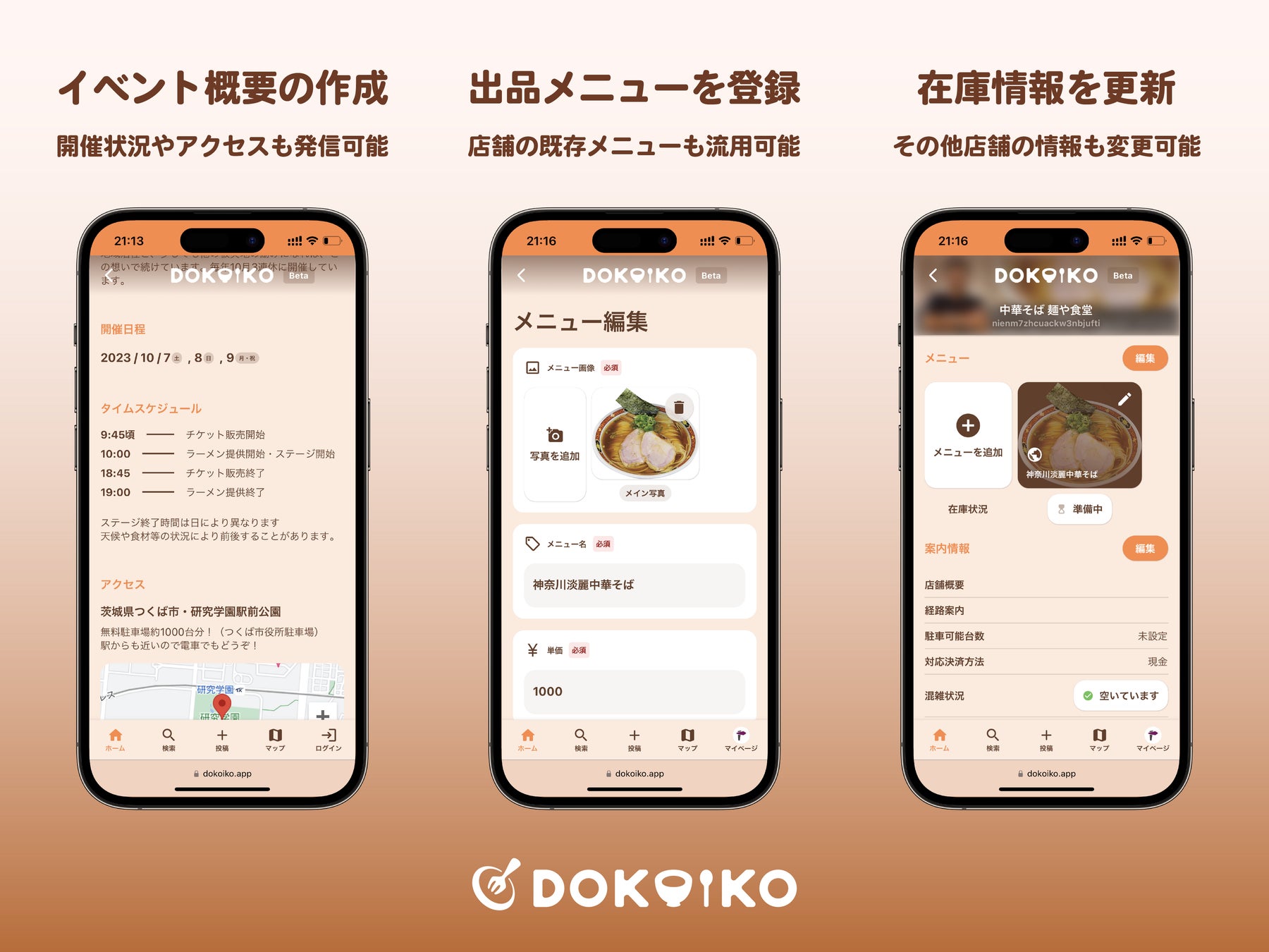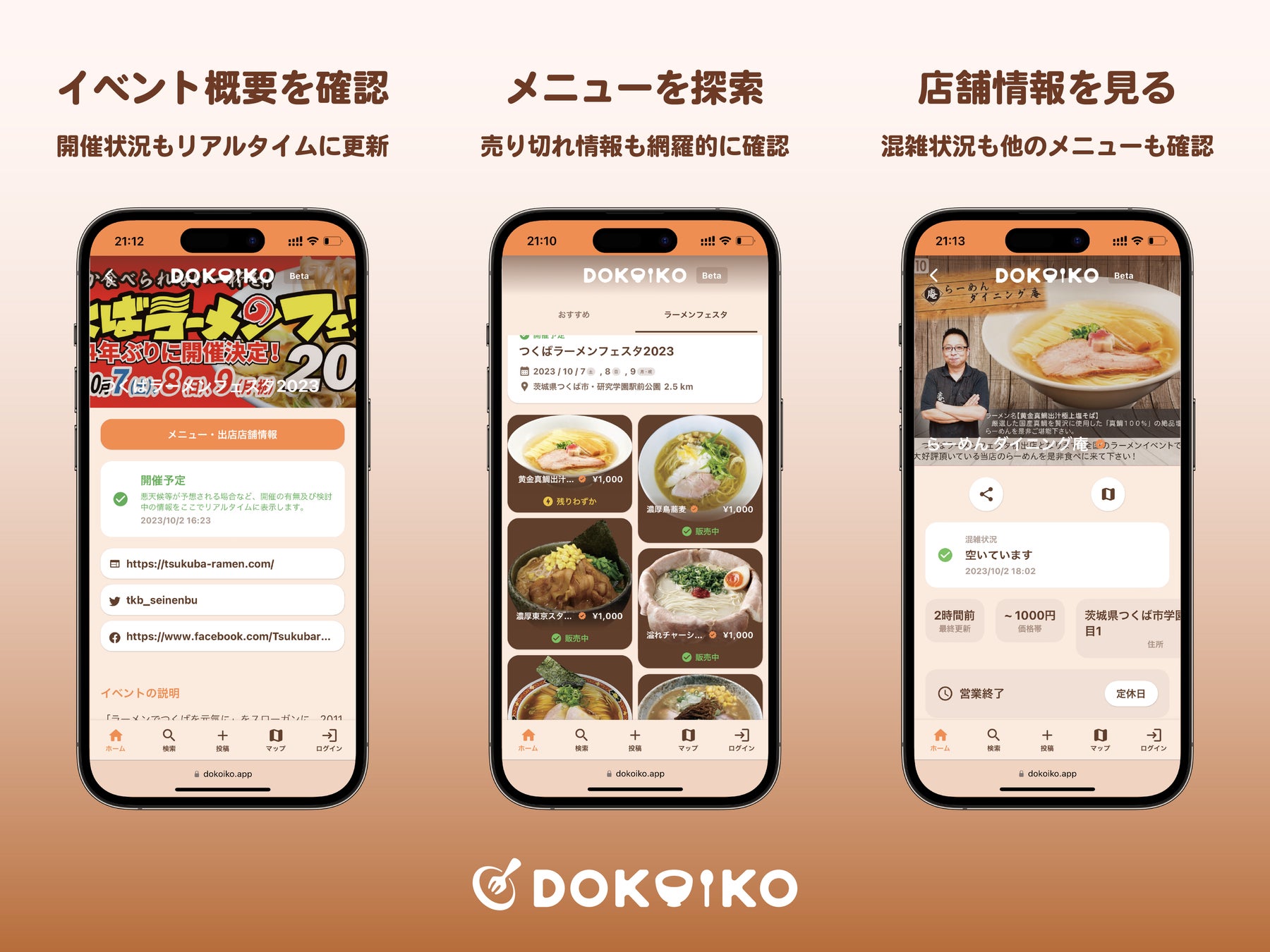 今回つくばラーメンフェスタにてご採用いただきましたdokoikoのイベント向け機能を、飲食を伴うイベントの主催者様を対象にご提供しております。