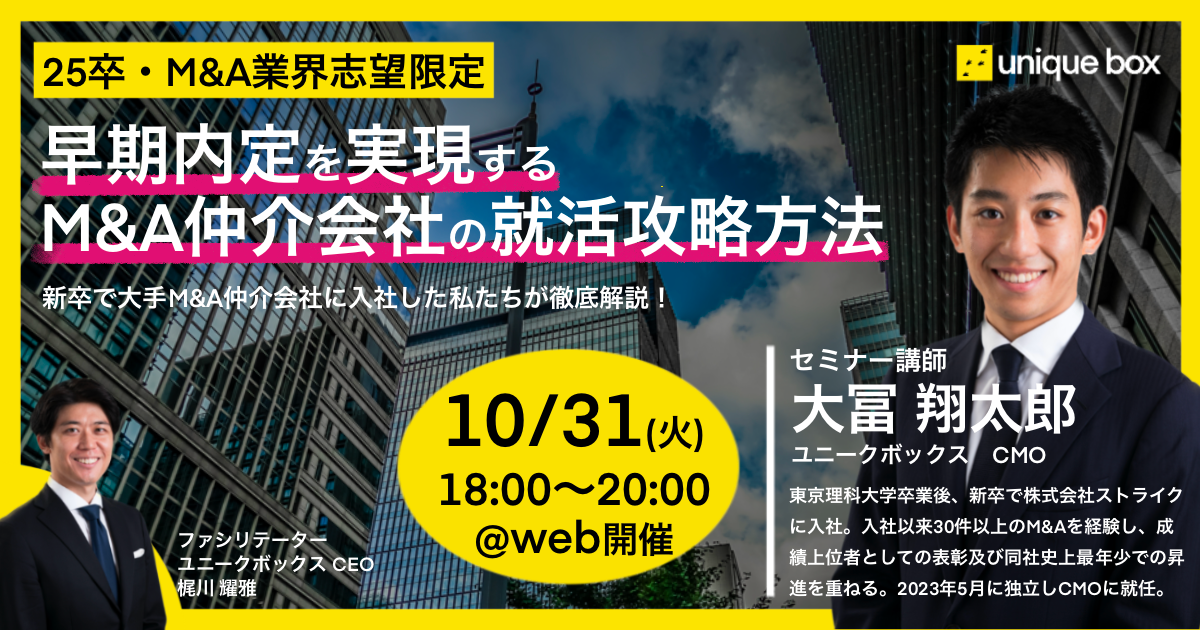 今回は、新卒で大手M&A仲介会社ストライクに入社した経歴を持つ、ユニークボックスの経営陣2名が、M&A仲介会社の就活攻略方法と題して、早期内定を実現するコツや、面接攻略の秘訣を徹底解説します。優秀な学生の就職先として近年大人気のM&A仲介会社への就職に関心がある方はぜひご参加ください。
