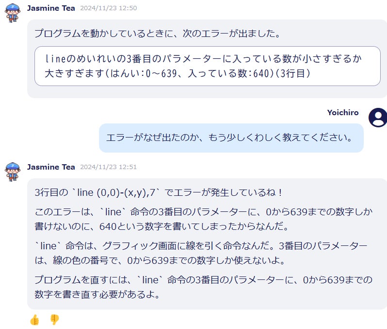 この機能は、プログラミング教育における大きな障壁である、初心者がプログラミング時にエラーに直面したときの挫折感や落胆感をAIによるヒント機能を使うことで防ぎ、ユーザーが楽しくプログラミングが学べるようにサポートします。