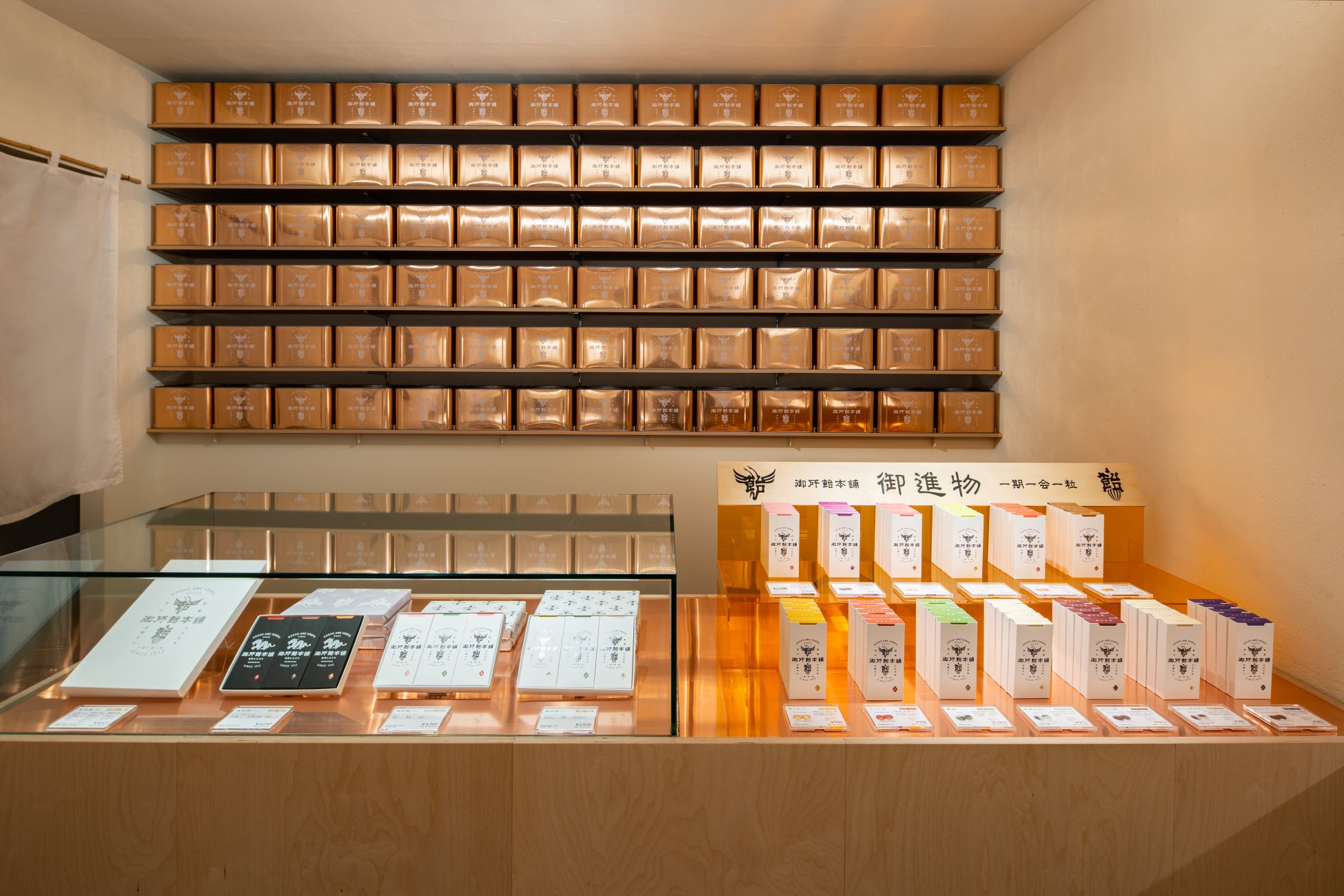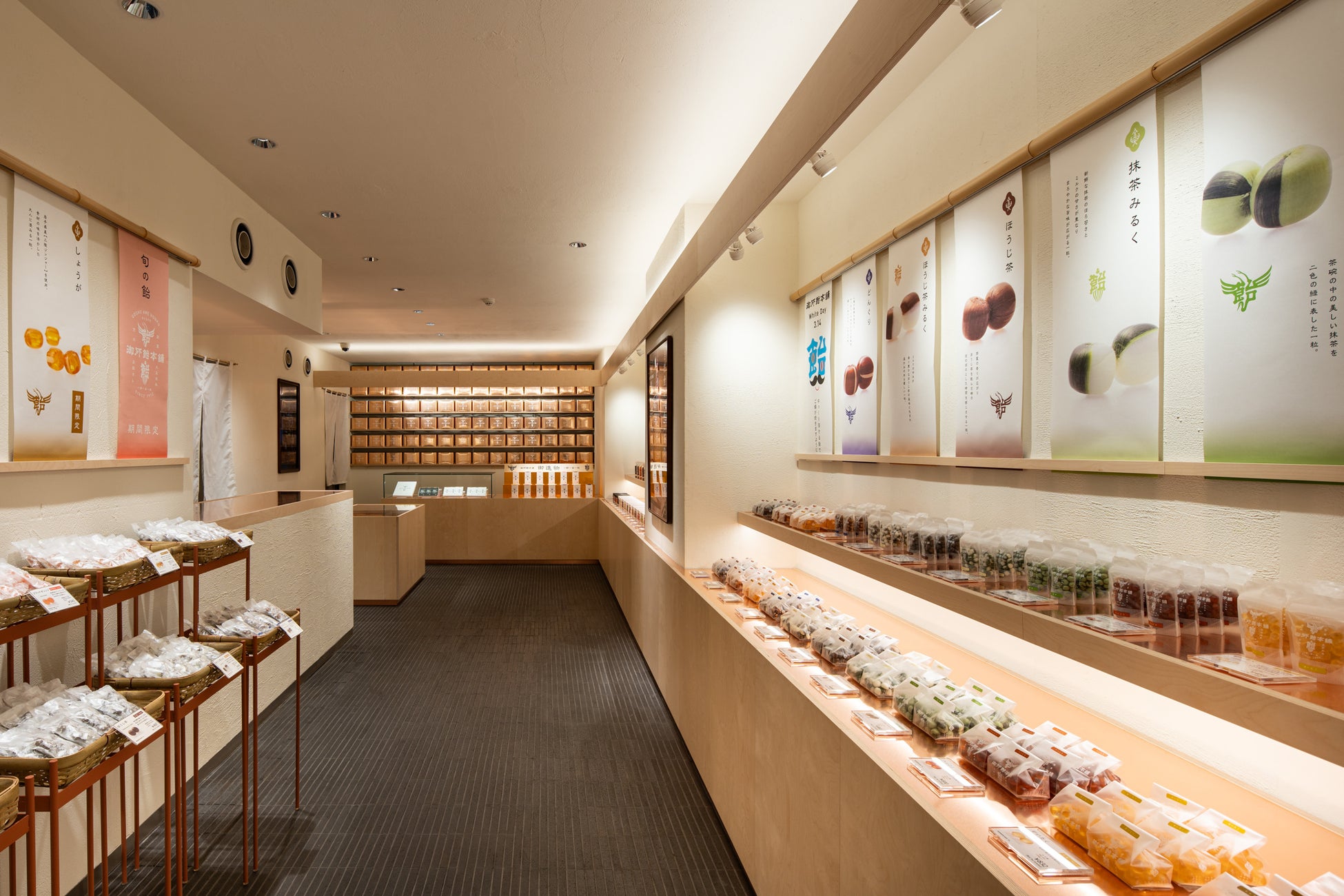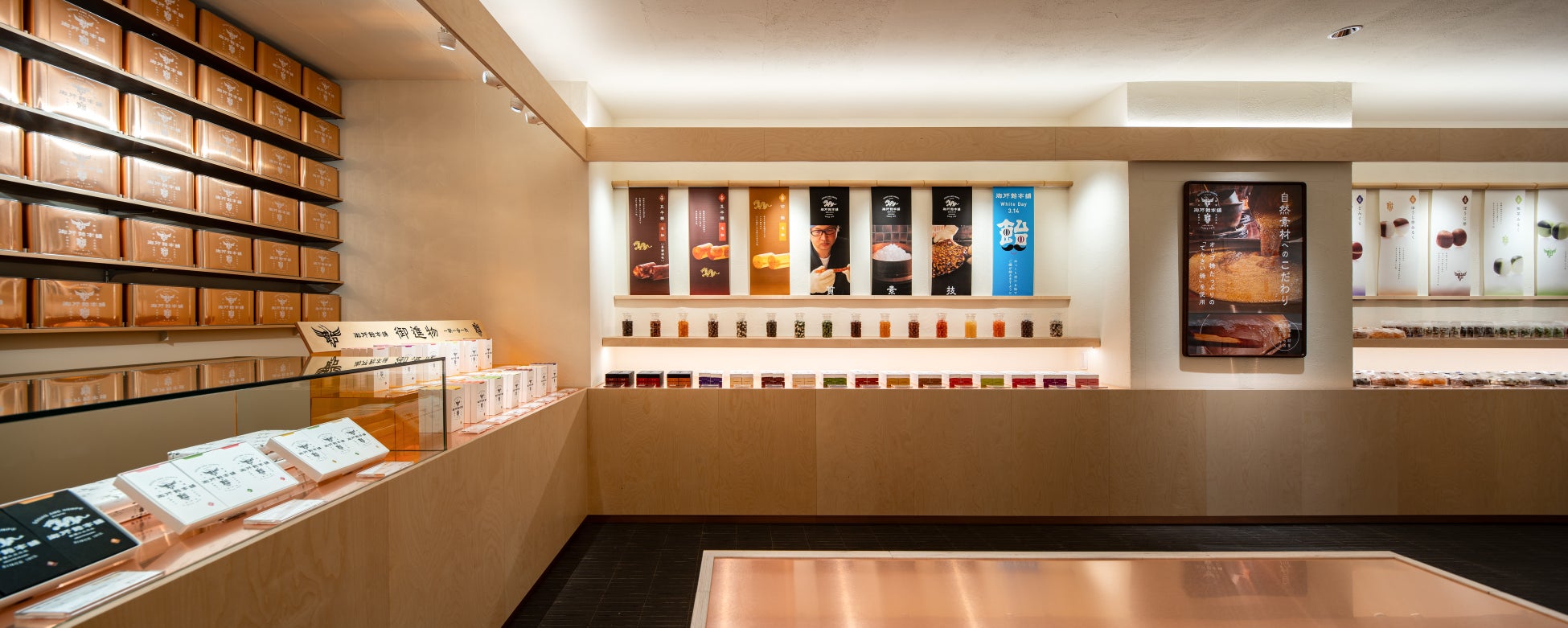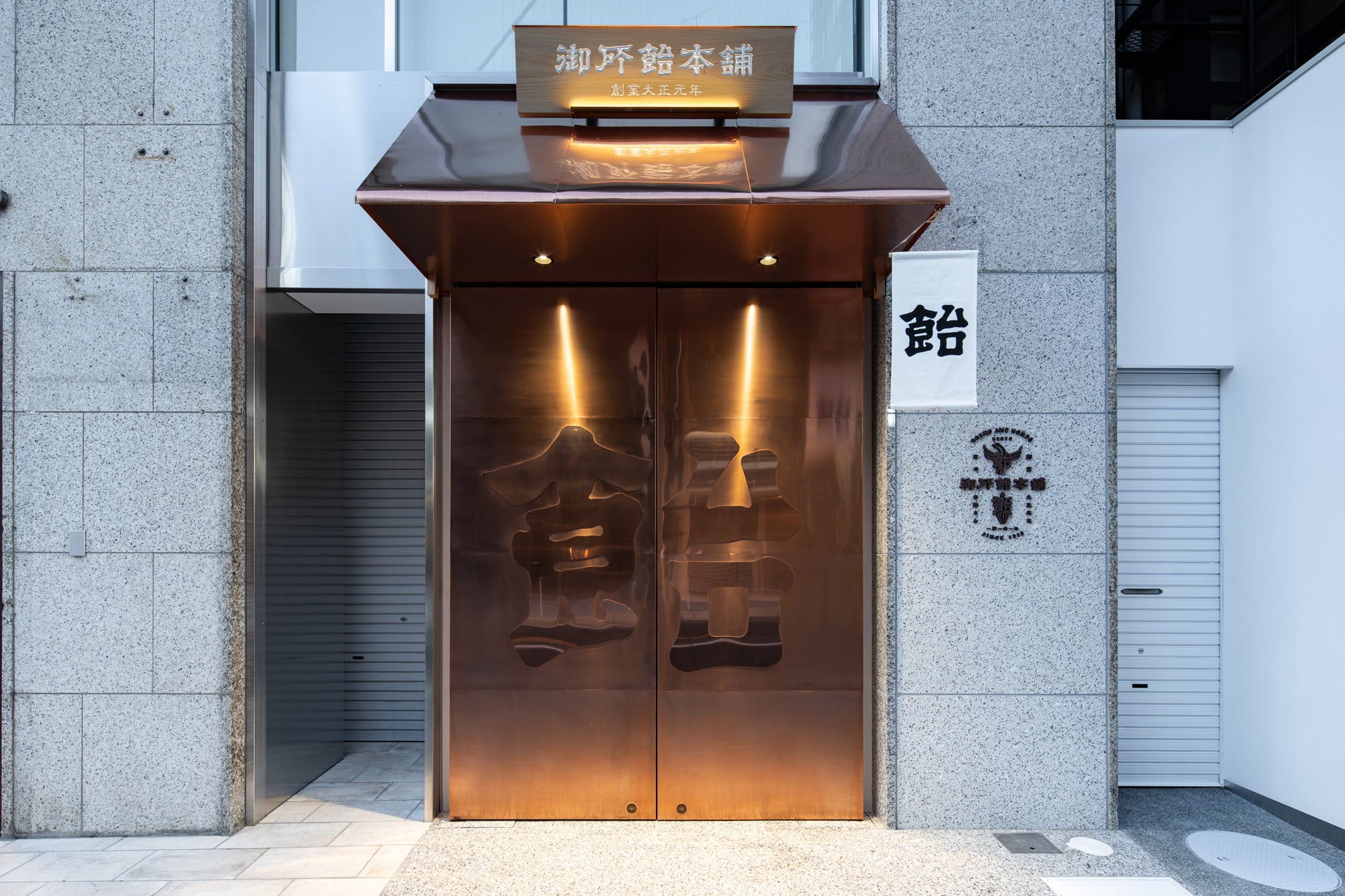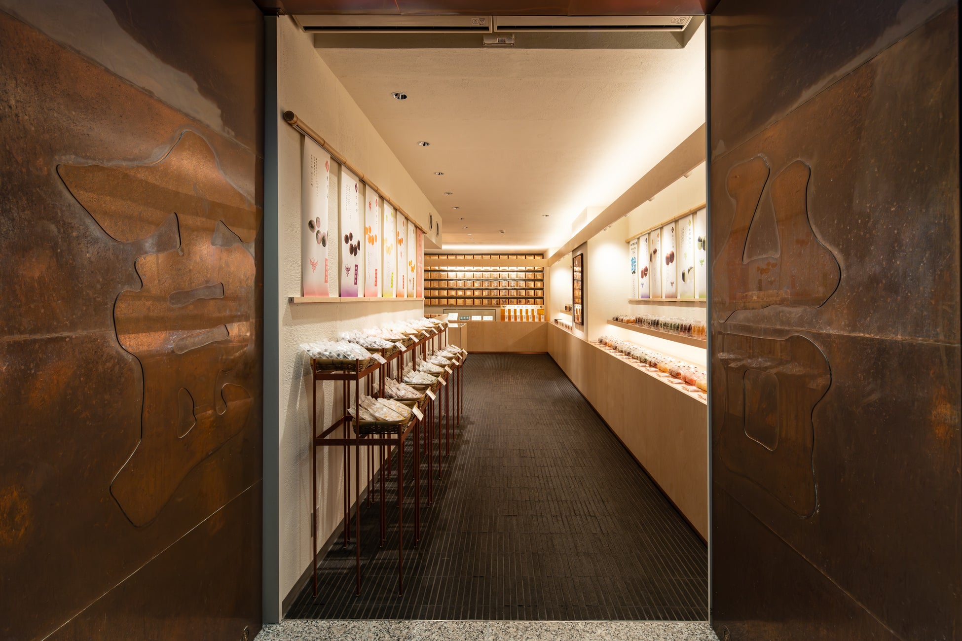 より多くの方に御所飴本舗のこだわりやクオリティを楽しんでいただけるよう、店舗をリニューアルいたしました。 店内はお客様に手にとっていただきやすい動線作りを念頭に、飴が美しく見えるライティングや装飾 を行いました。また、飴を銅鍋で炊く当店の特徴から、店舗の入り口や細部に銅をあしらった装飾を施しております。
