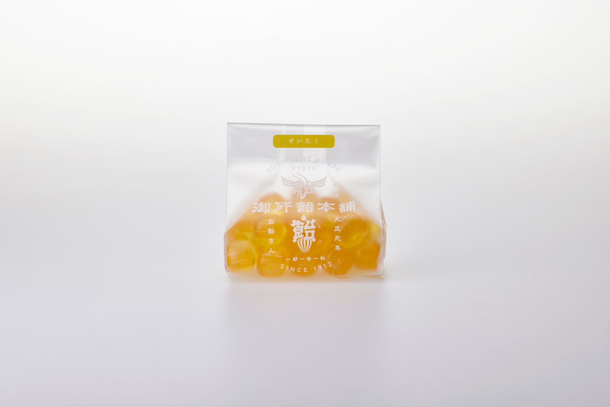 レギュラー商品の『ぜいたく飴』は、日本古来の甘味料である米飴を使用しています。 芳醇な甘さの奥にある香ばしい風味が特徴です。 黄金色に輝くその見た目から、「ぜいたく飴」と名付けております。