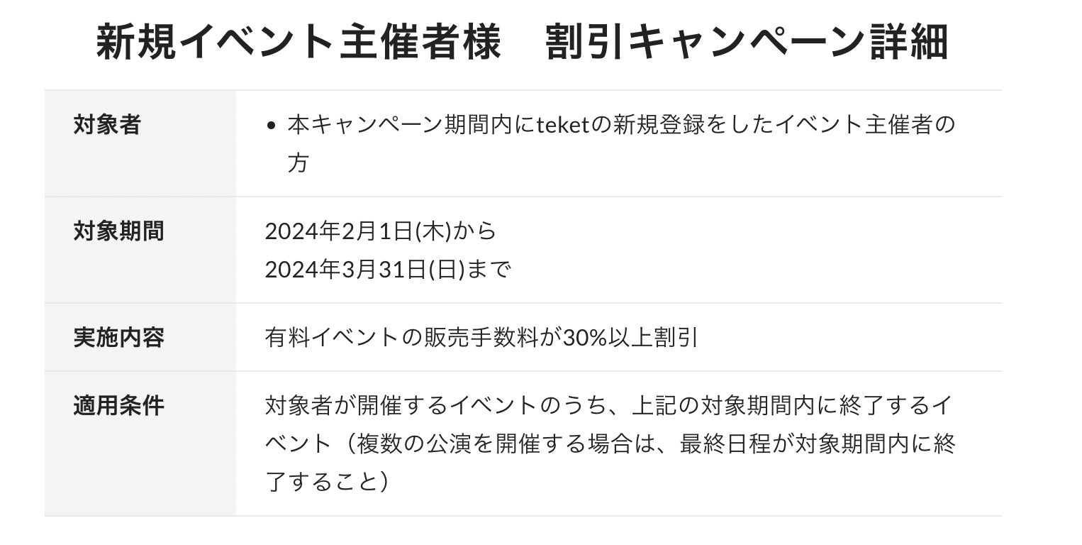キャンペーン期間中、新規のイベント主催者様の方に限り、通常、teketで有料イベントを行う場合にかかる販売手数料が、30%以上割引になります!