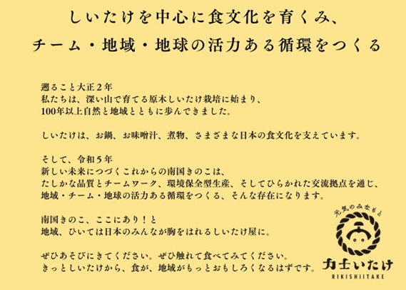 南国きのこは、「しいたけを中心に食文化をはぐくむみ、チーム、地域、そして地球の活力ある循環をつくる」この志を新たに掲げました。地域の方をはじめ若い世代の方々にも親しんでいただける機会を自ら作り、地域の発展にも貢献してまいります。