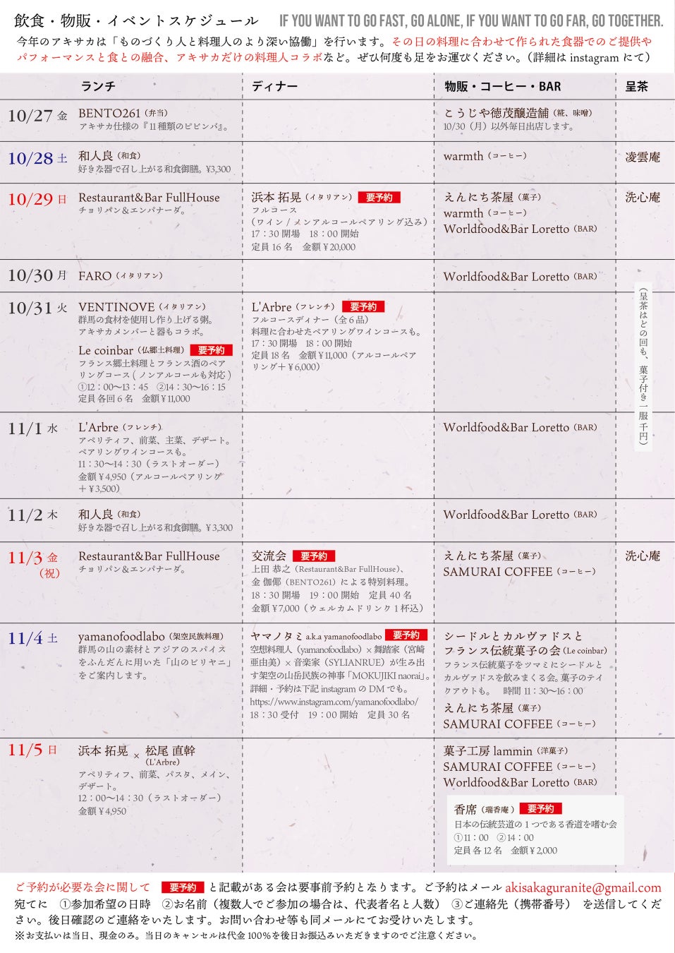 四万温泉のお膝元、ゆったりとした時間の流れる自然豊かな芸術の街群馬県中之条町にある旧廣盛酒造にて、モノづくり作家や表現者、料理人の総勢33名が、10日間で20を超えるその時限りのイベントを開催します。特別なメニューをこだわりの食器で楽しめるほか、作家ごとの作品空間もあり、購入も可能。アーティスト集団の本気を感じにぜひお越しください。各イベントには予約が必要な回が有り、人気のイベントは早めの予約がおすすめ。