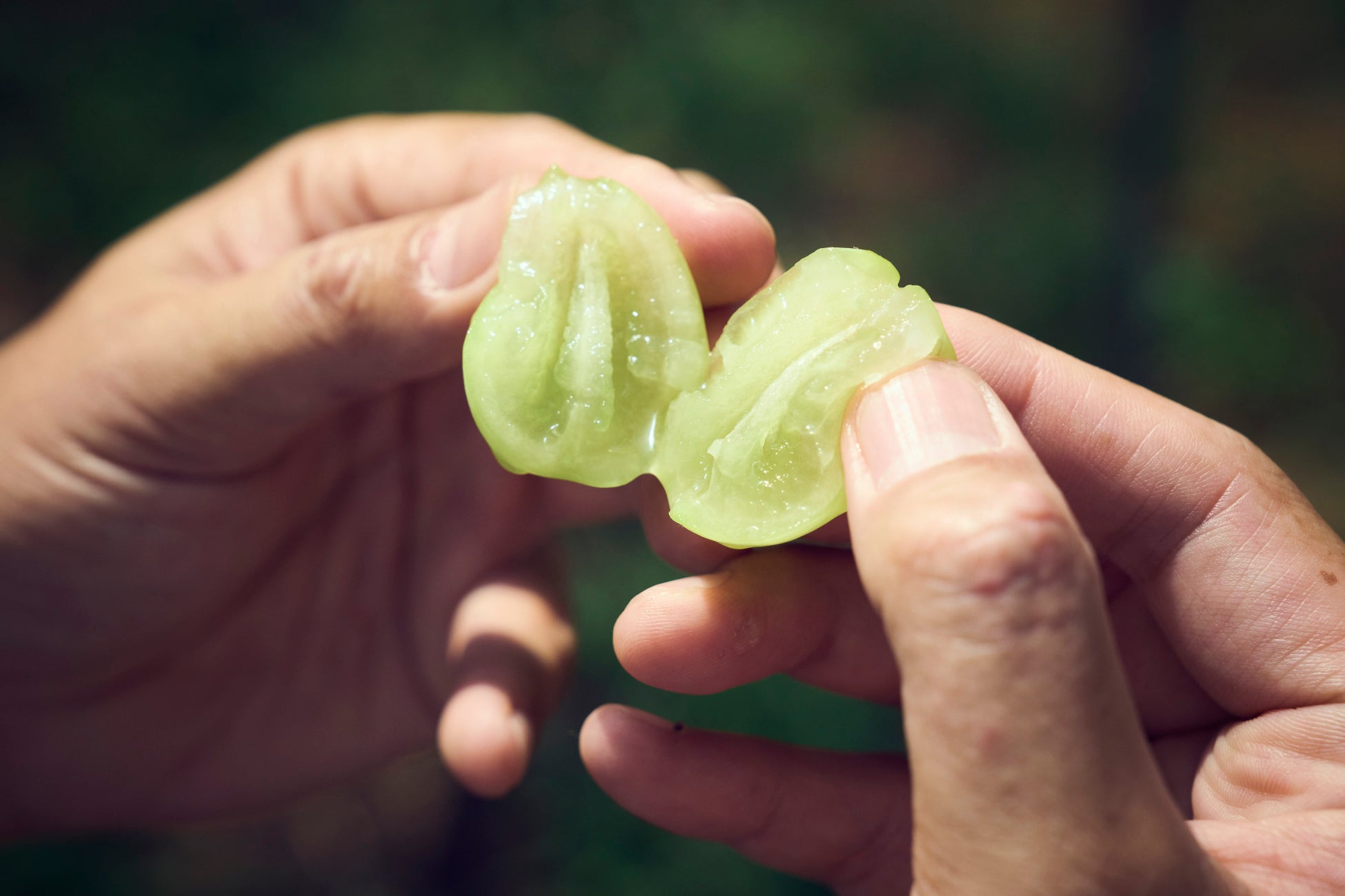 シャインマスカットの美味しさを支えるのは味わいだけでなく、食べた時の皮のハリやジューシーな食感です。歯応えを感じつつも口に残らないような皮の硬さと歯切れの良さを追求し、専用の設備を設けて果肉のテクスチャーを計測。一粒を口にした時の本当の美味しさにこだわってザ・ナンバードを厳選しています。