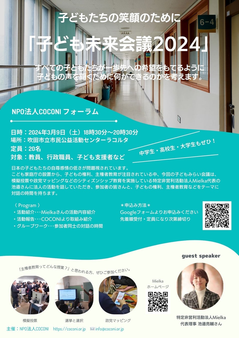 こども家庭庁の発足後、子ども権利、主権者教育が注目されている中、今回のこどもみらい会議は、模擬投票や政党マッピングなどのシチズンシップ教育を実施している特定非営利活動法人Mielka代表の池邉さんに団体の活動紹介をしていただき、参加者の皆さんと対話の時間を持ちます。