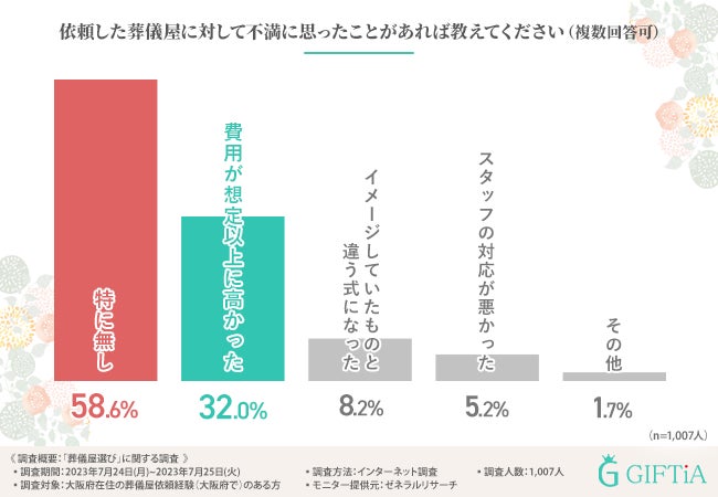 「依頼した葬儀屋に対して不満に思ったことがあれば教えてください(複数回答可)」と質問したところ、『費用が想定以上に高かった(32.0%)』と回答した方が多く、次いで『イメージしていたものと違う式になった(8.2%)』『スタッフの対応が悪かった(5.2%)』と続きました。