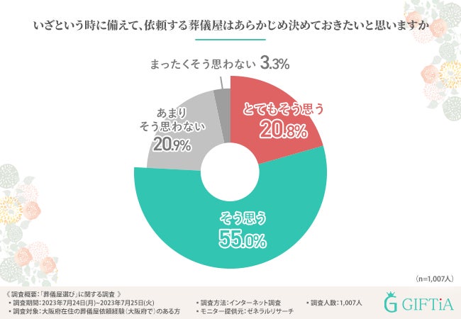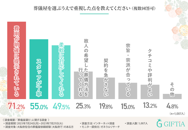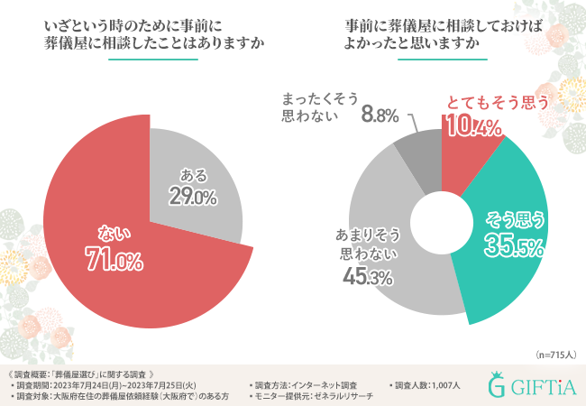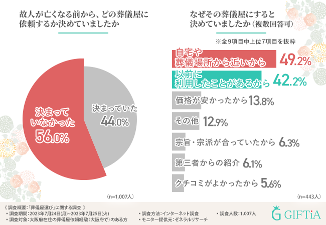 そこで今回、ギフト、ノベルティ事業を手掛ける株式会社ギフティア(https://giftia.co.jp/)は、大阪府在住の葬儀屋依頼経験のある方を対象に、「葬儀屋選び」に関する調査を実施しました。