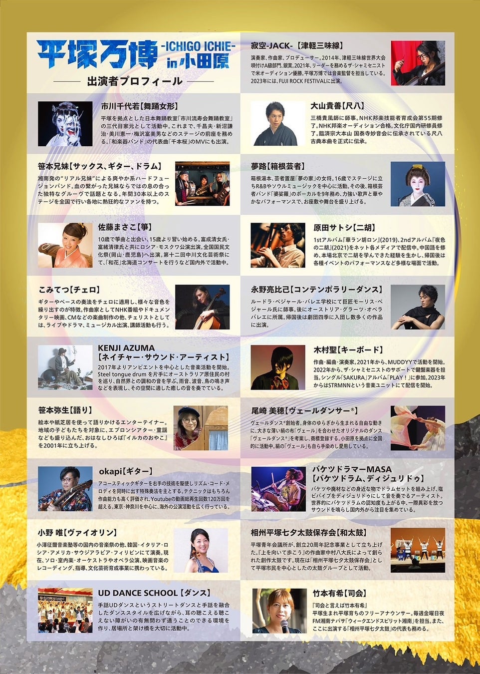 「平塚万博 -ICHIGO ICHIE- in小田原」には、先に開催の平塚万博に出演の15組*のアーティストに、さらに4組のアーティストが加わり、“一期一会”をテーマに、平塚公演では観ることのできなかったプログラムを展開します。三味線や尺八、箏、和太鼓などの和楽器、二胡やチェロ、バンドによる演奏から、日本舞踊、コンテンポラリーダンス、語りまで、日本のみならず世界でも活躍する実力派アーティストが小田原に集結し、「音」と「舞」と「言葉」の一期一会の物語を紡ぎます。*MC含む