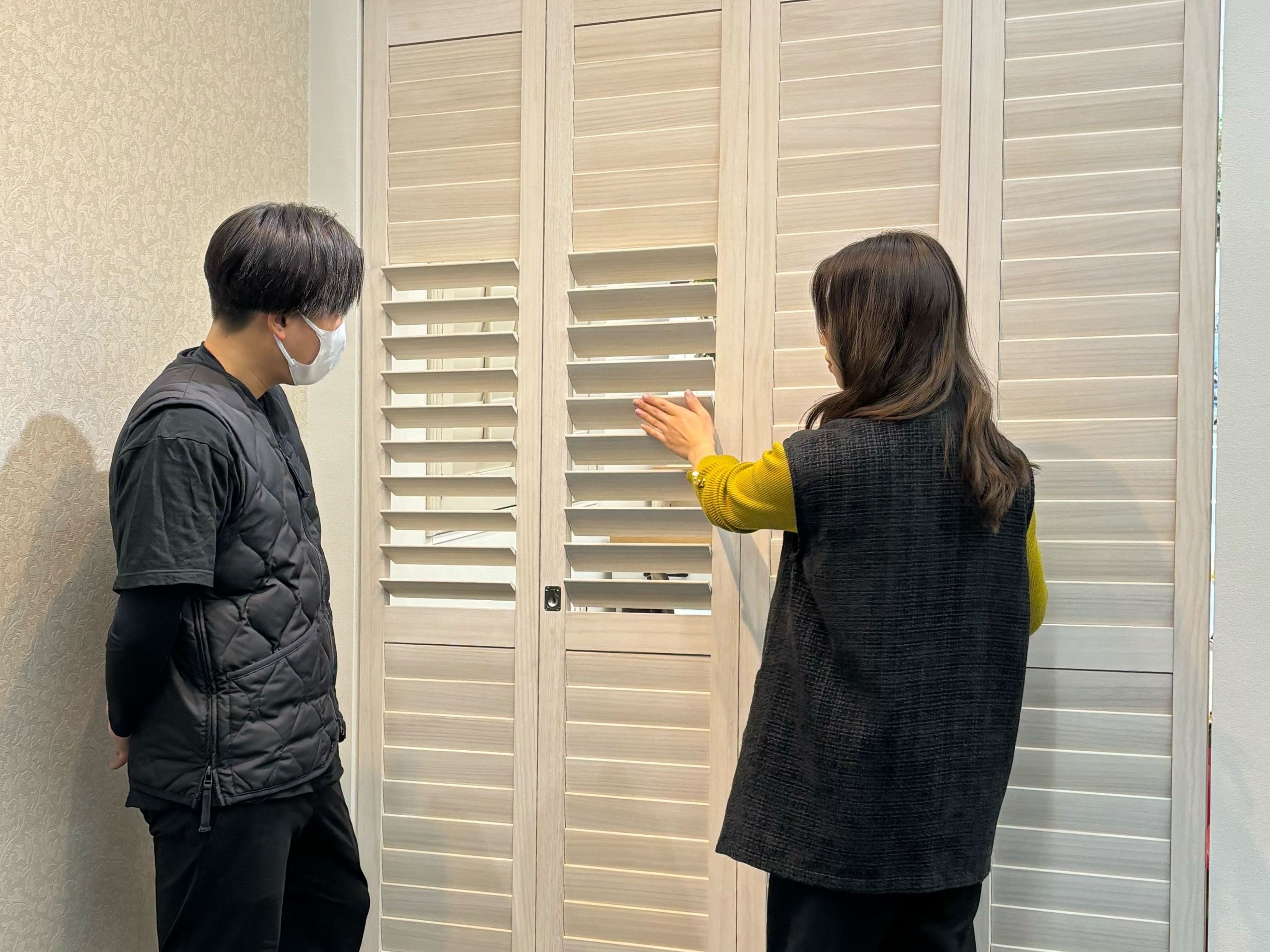お客様が見学の際は弊社の専門スタッフが製品をご案内します。お客様の図面や窓の写真を見ながら、製品や取り付け方法などを考慮し、よりよいご提案をいたします。