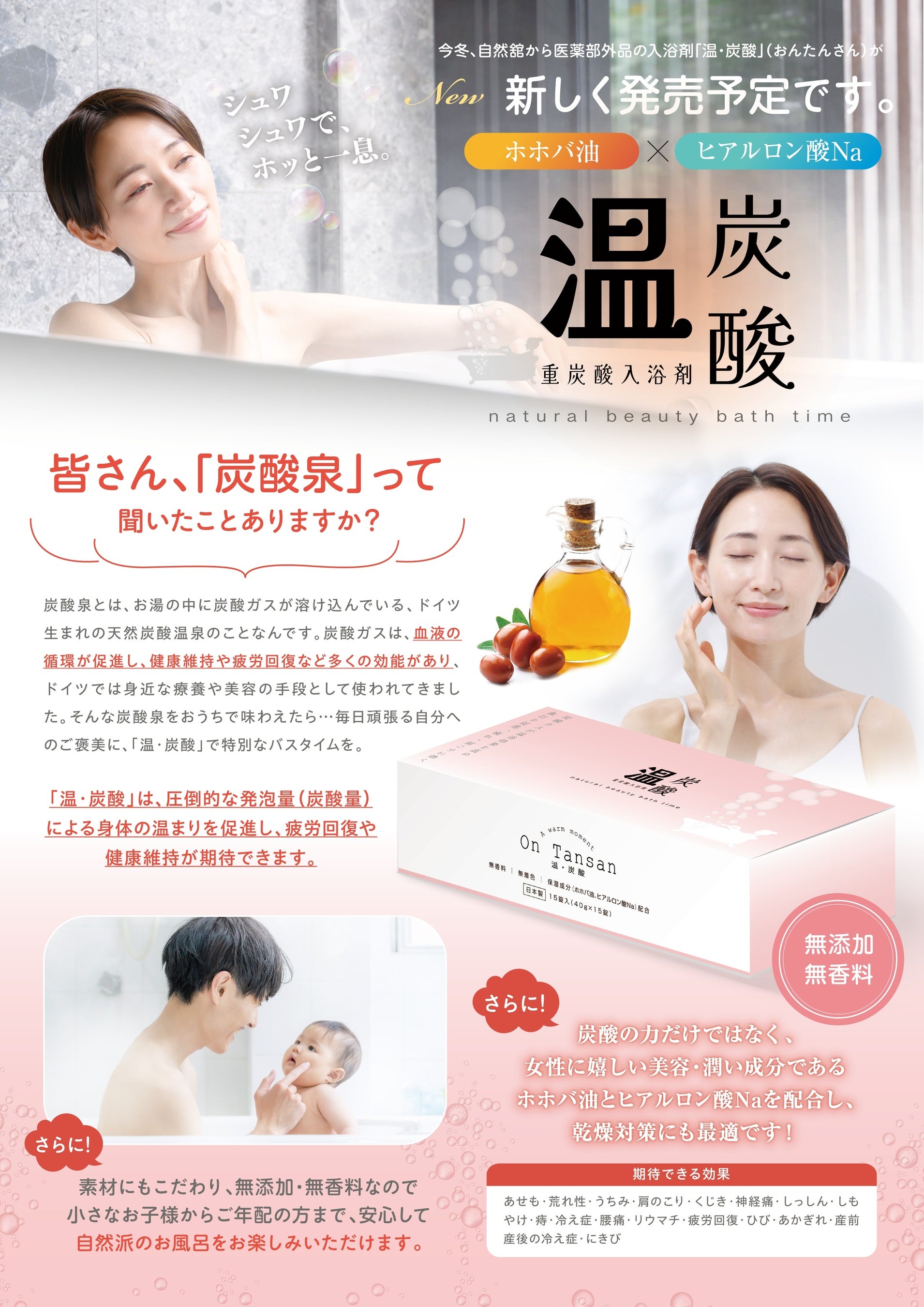 今回リリースします「温・炭酸」は自宅で簡単に炭酸泉を感じることが出来ます。普段のお風呂を、よりリラックスさせ、自然派の入浴をお楽しみください。