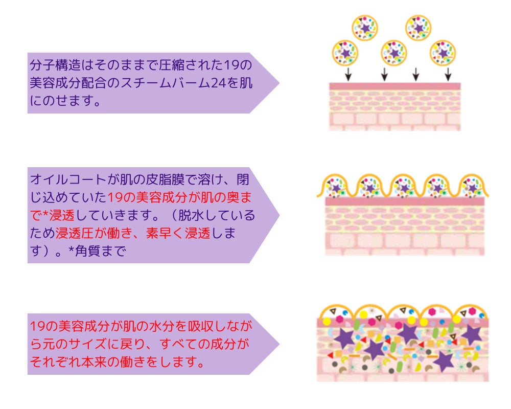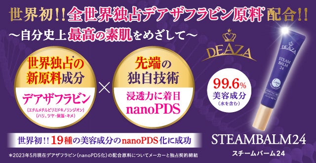 全世界独占原料『デアザフラビン(nanoPDS化)』を含む19の美容成分のnanoPDS化に成功。≪自分史上最高の素肌へ!!≫をコンセプトに誕生したスチームバーム24は、24時間至極の肌を目指します。