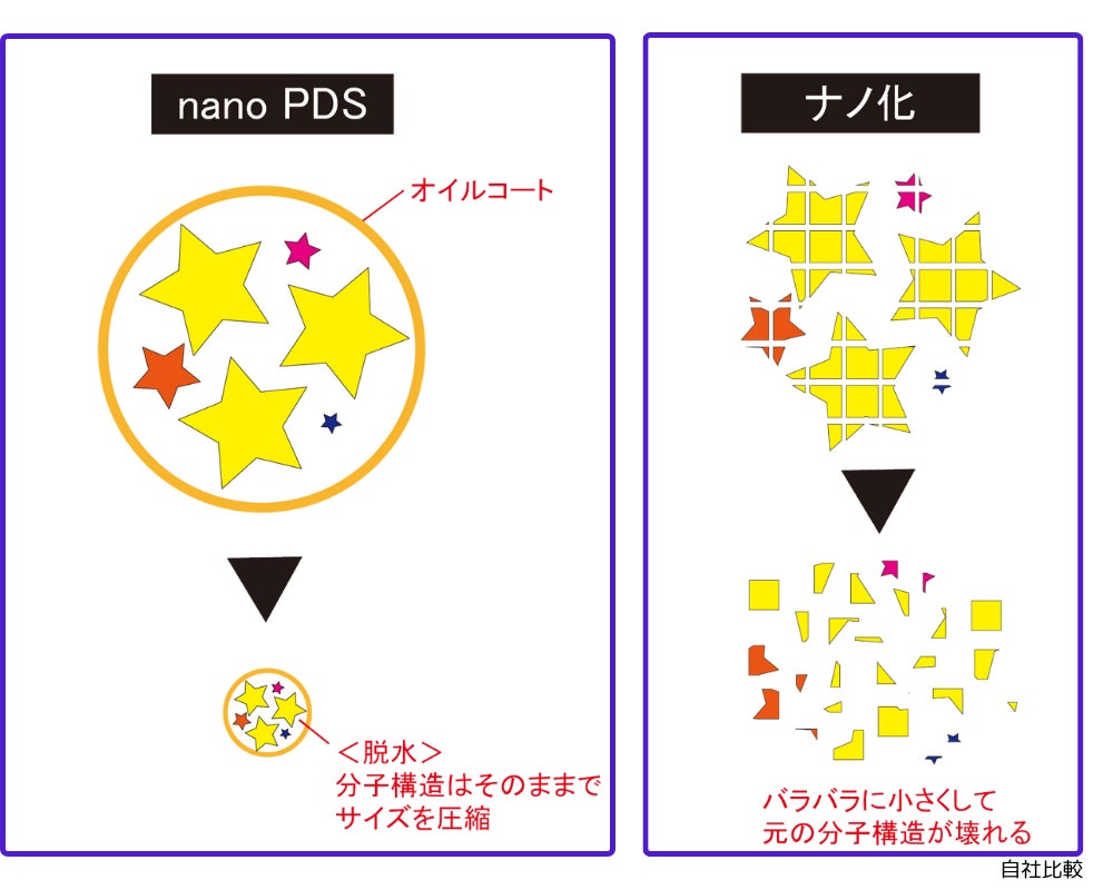 ※nanoPDS化とは:浸透に着目した技術で分子構造をキープしたままナノ化するので、成分そのものの働きをします。