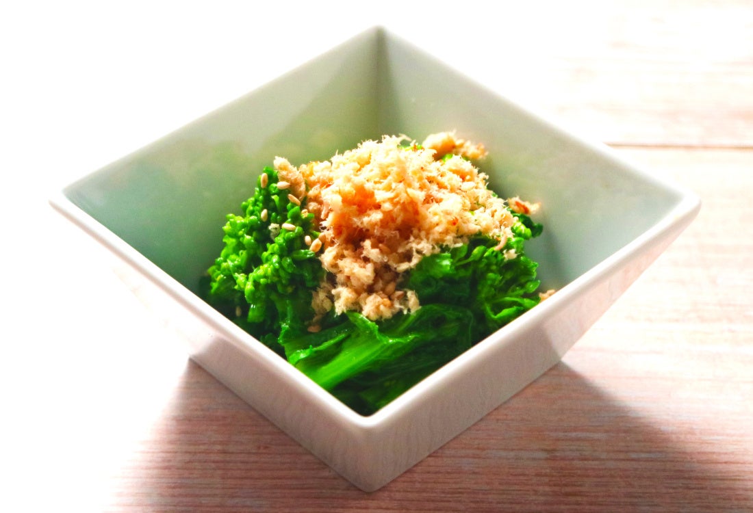 菜の花を食用に品種改良した野菜で、サッとゆがくと鮮やかな緑色になります。