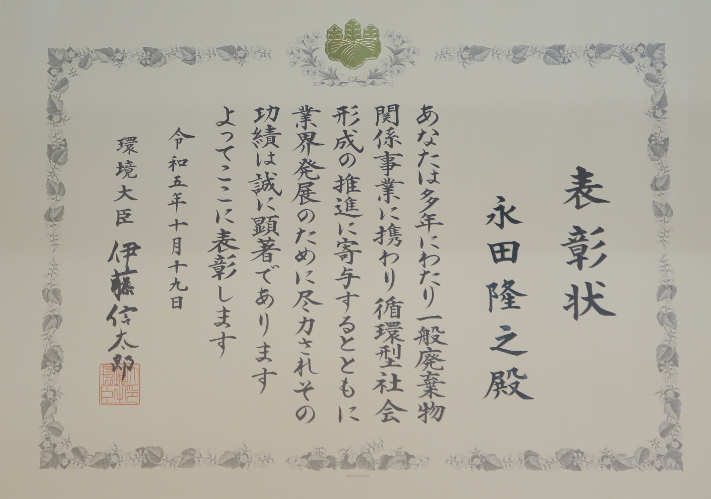 本表彰は、多年にわたり廃棄物の適正処理の確保などに尽力し、循環型社会の形成や生活環境の保全に貢献した功績が認められ、環境大臣より表彰されるものです。