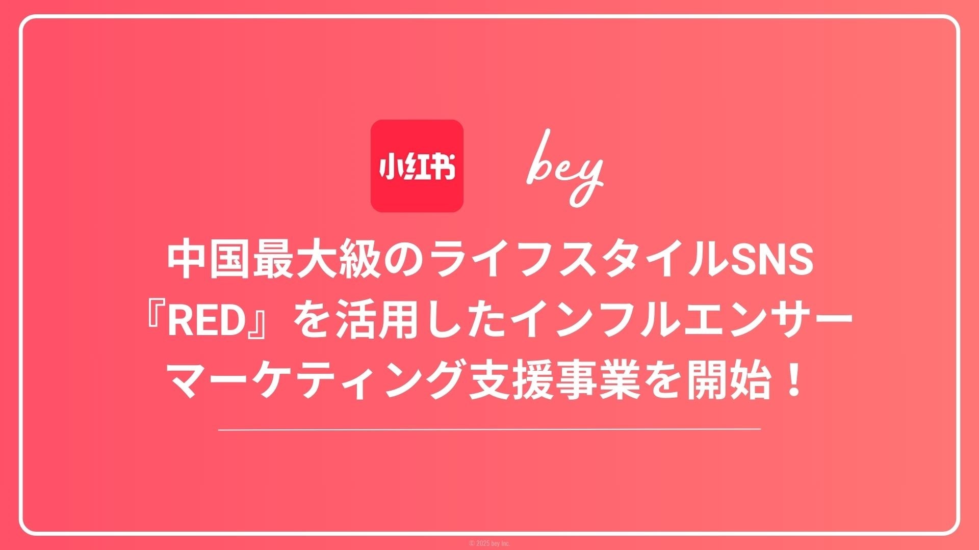 bey株式会社(本社:東京都渋谷区、代表取締役:小泉 広明、以下「bey」)は、中国最大級のライフスタイルSNS『RED(小红书)』を活用したインフルエンサーマーケティング支援事業を開始しました。本サービスでは、REDを活用したプロモーション戦略の策定から、適切なインフルエンサーのアサイン、投稿企画・制作、効果測定までを包括的に支援し、日本企業の中国市場進出をサポートします。