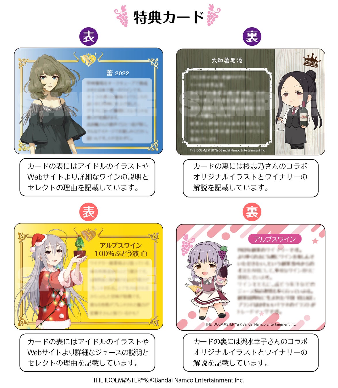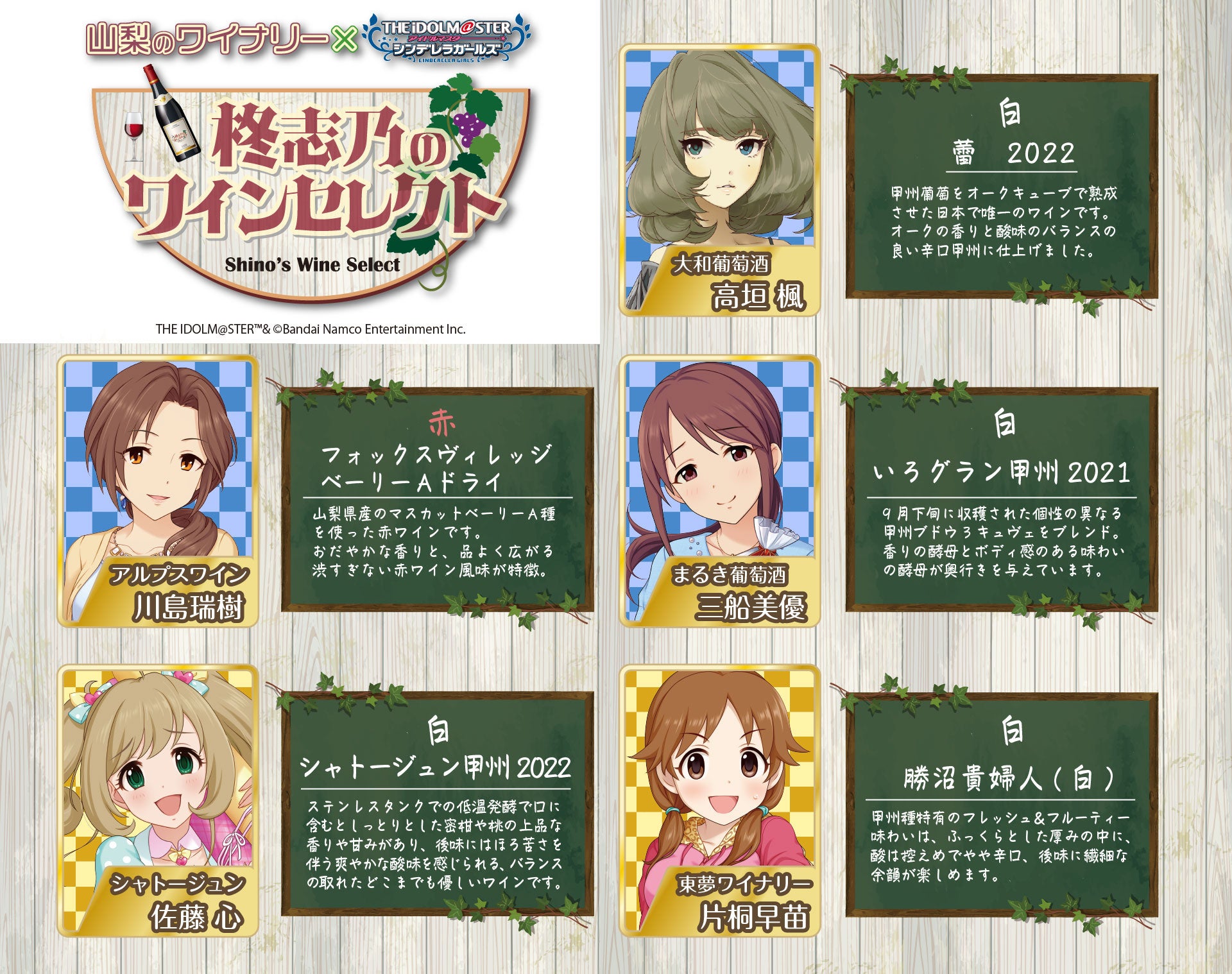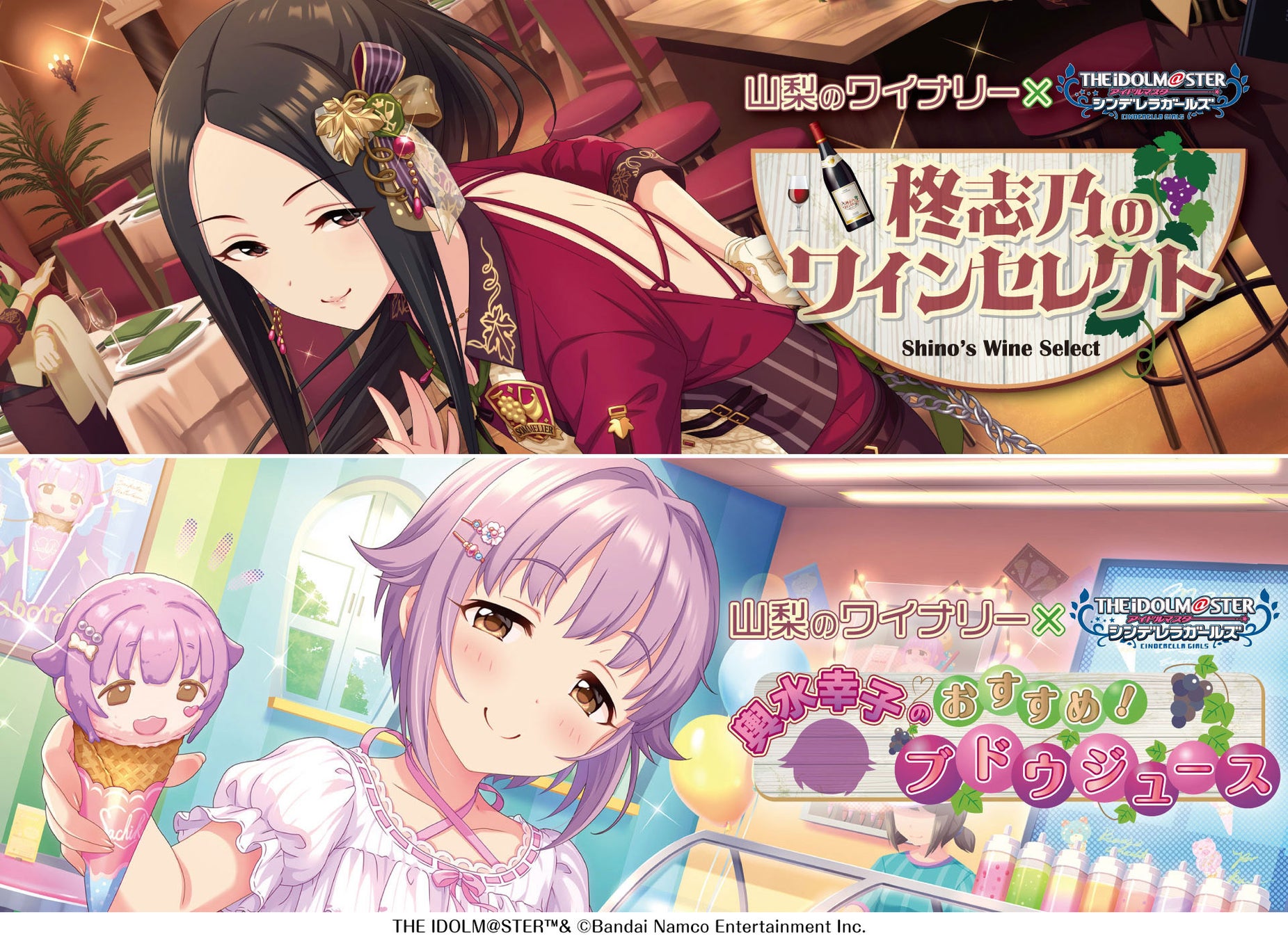 アイドルマスター シンデレラガールズの山梨県出身アイドル「柊志乃」と「輿水幸子」を中心とした山梨県のワイナリーとのコラボ企画です。