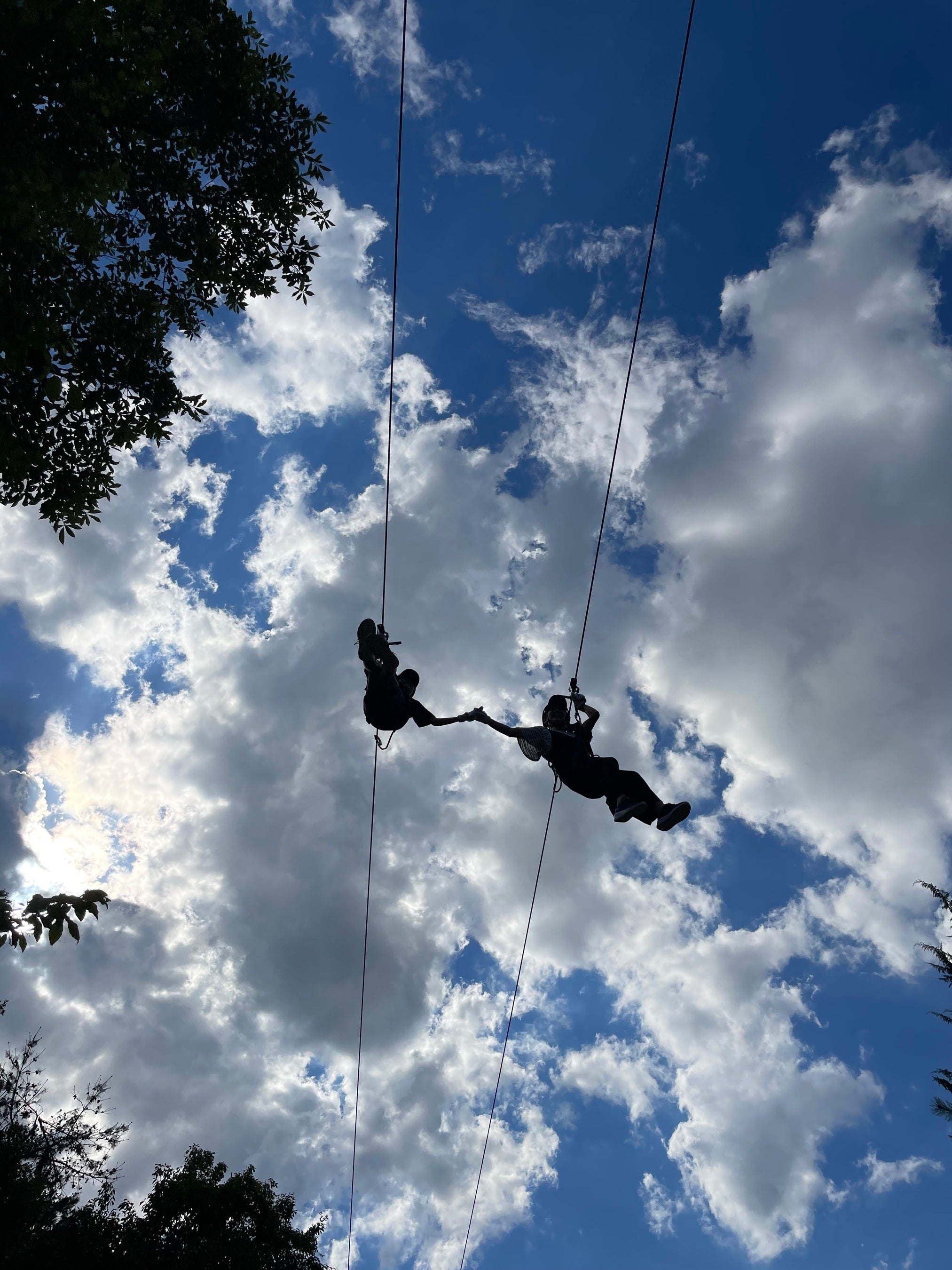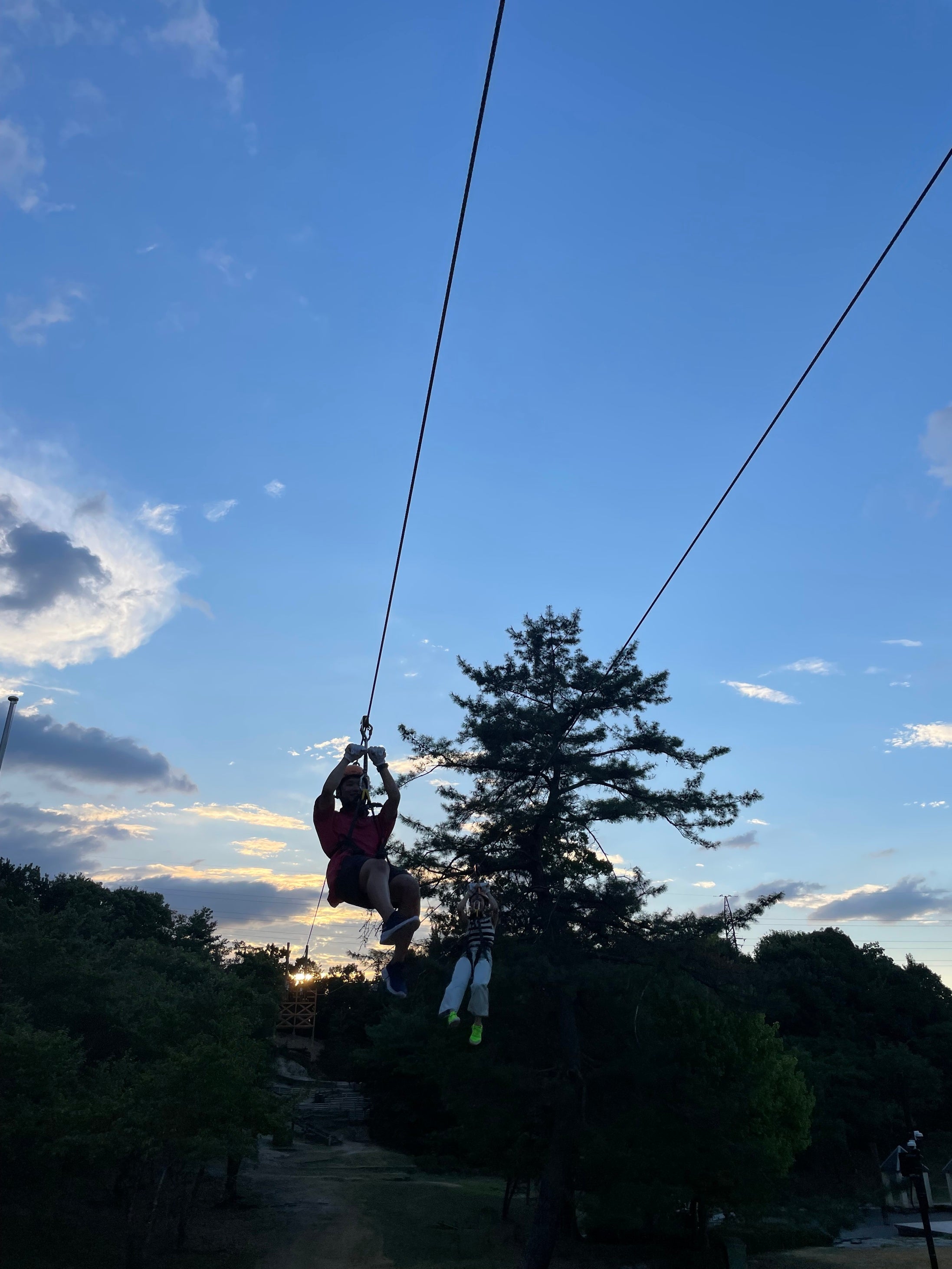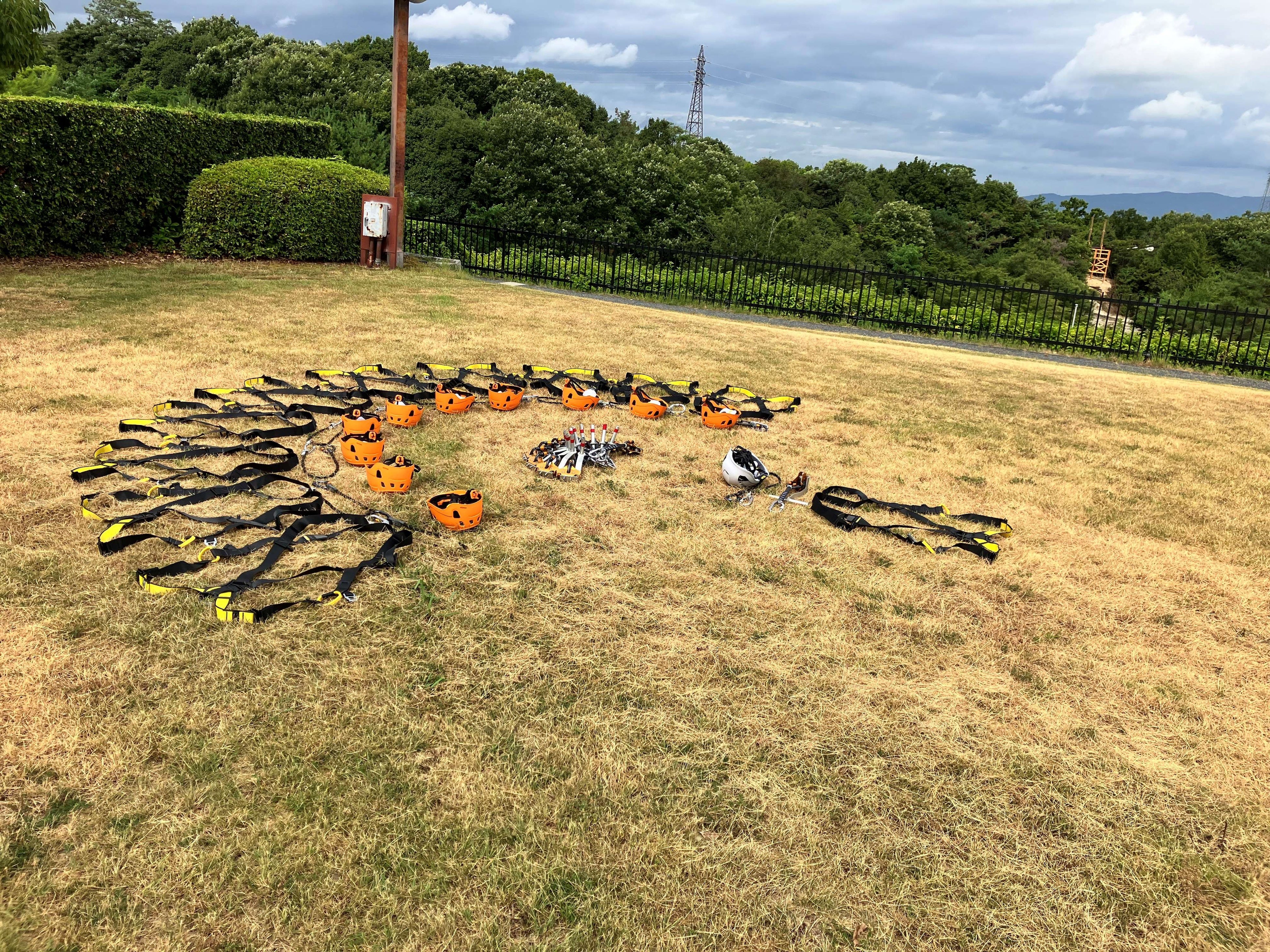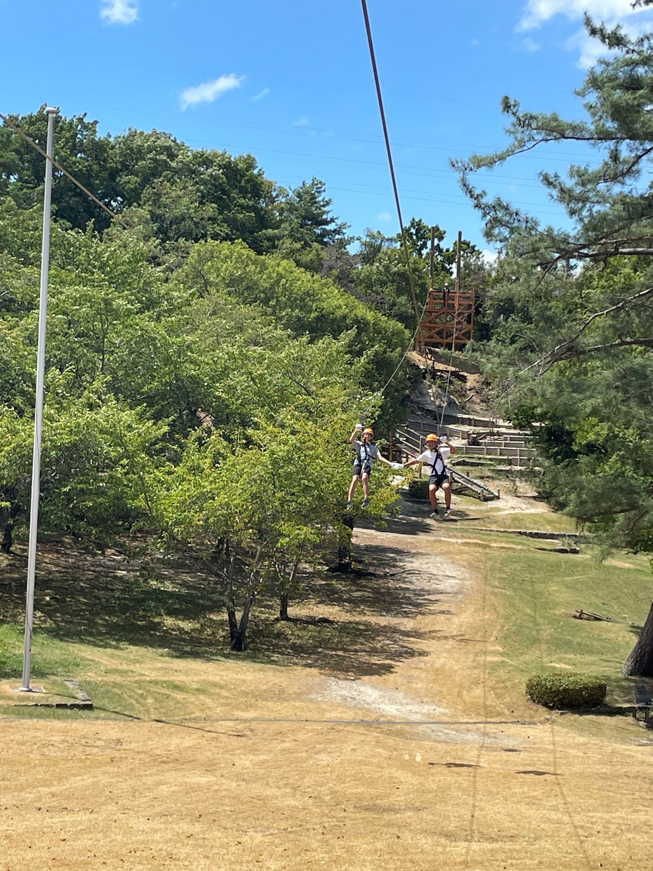 コース間移動中のツアーガイドによる森の散策、遊びの森・ふるさとの森エリアの自然地形を活かした新たな体験施設(森の空中散歩)としてジップラインを設置しました。