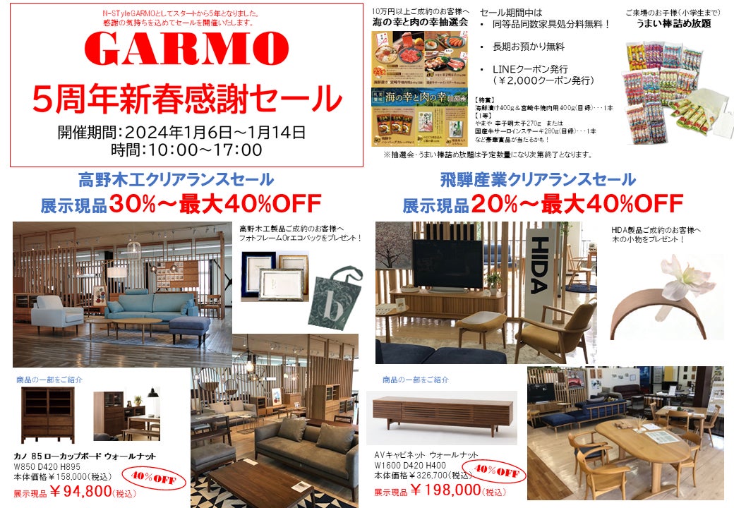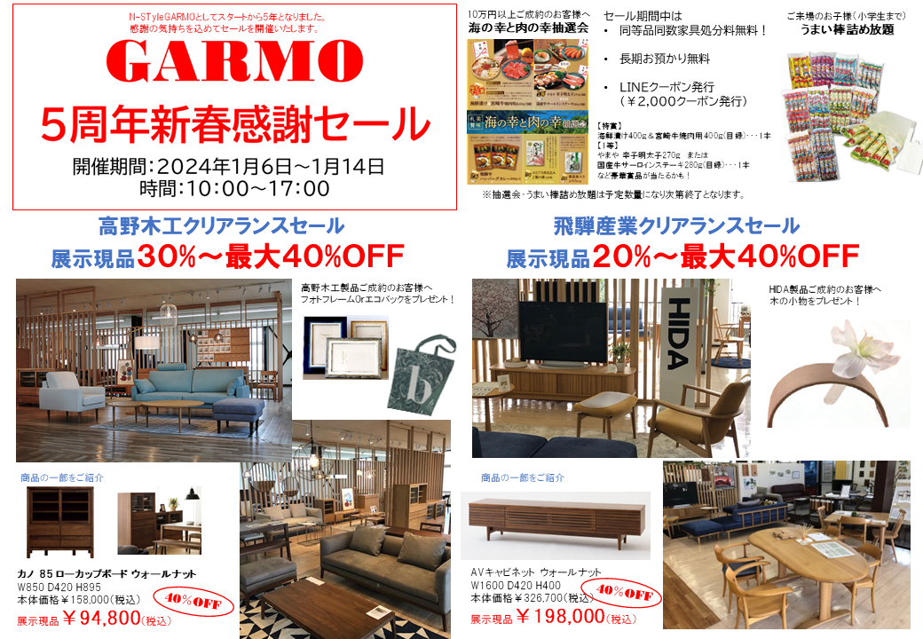 家具・インテリア販売ショールーム(N-style GARMO 特設会場 運営会社 株式会社 日進 https://www.nisshin56.com/)で開催される「5周年新春感謝セール」の期間中、飛騨産業 と 高野木工 のクリアランスセールが同時開催されます。